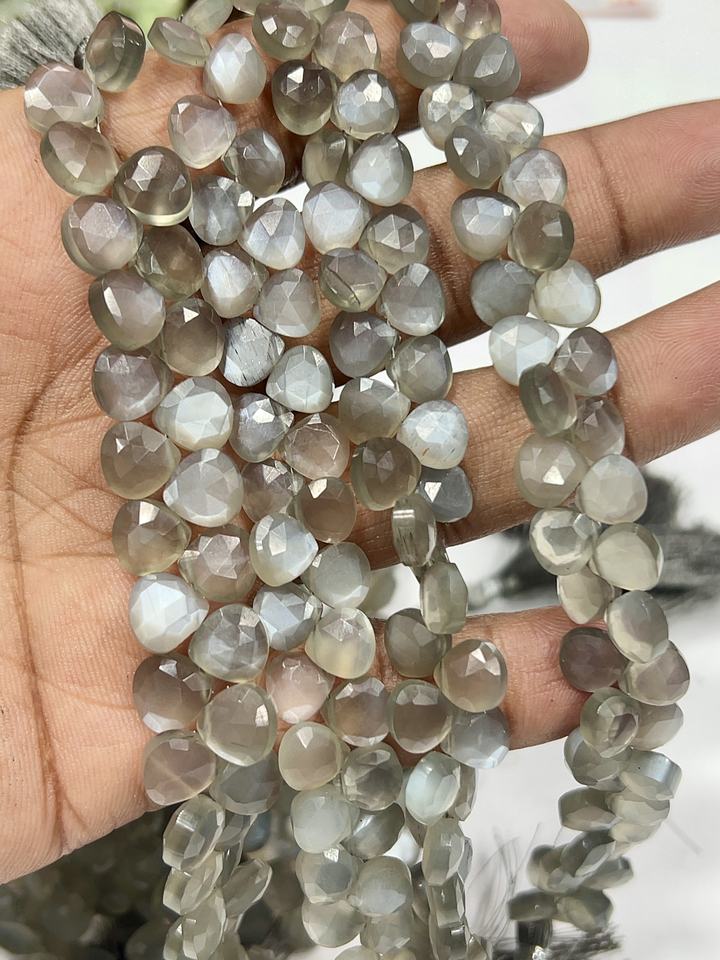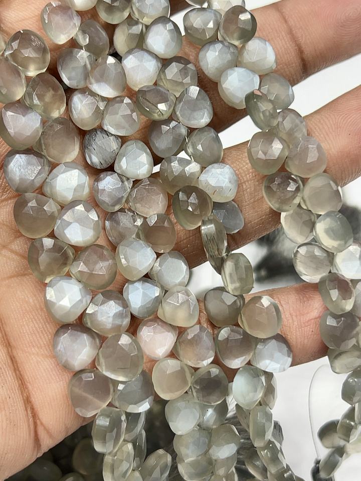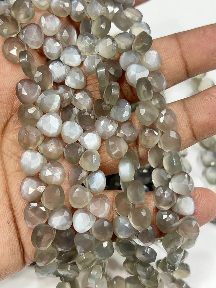 ลูกปัดมูนสโตนสีเทาธรรมชาติทรงหัวใจเจียระไน ขนาดประมาณ 6-7 มม. สายไฟยาว 8 นิ้ว ได้รับการรับรองมาตรฐาน AIGS Alif