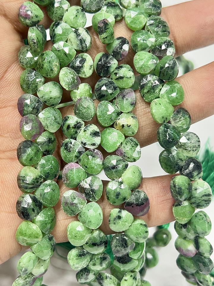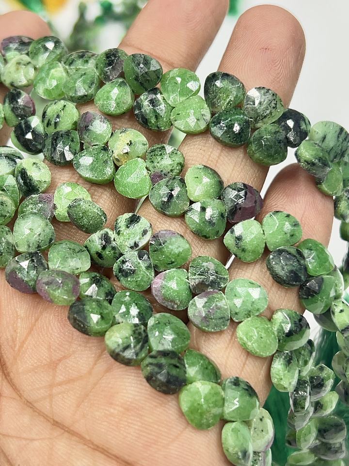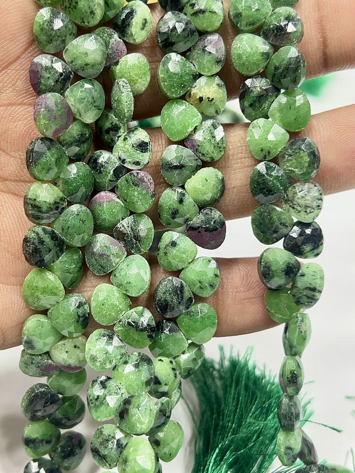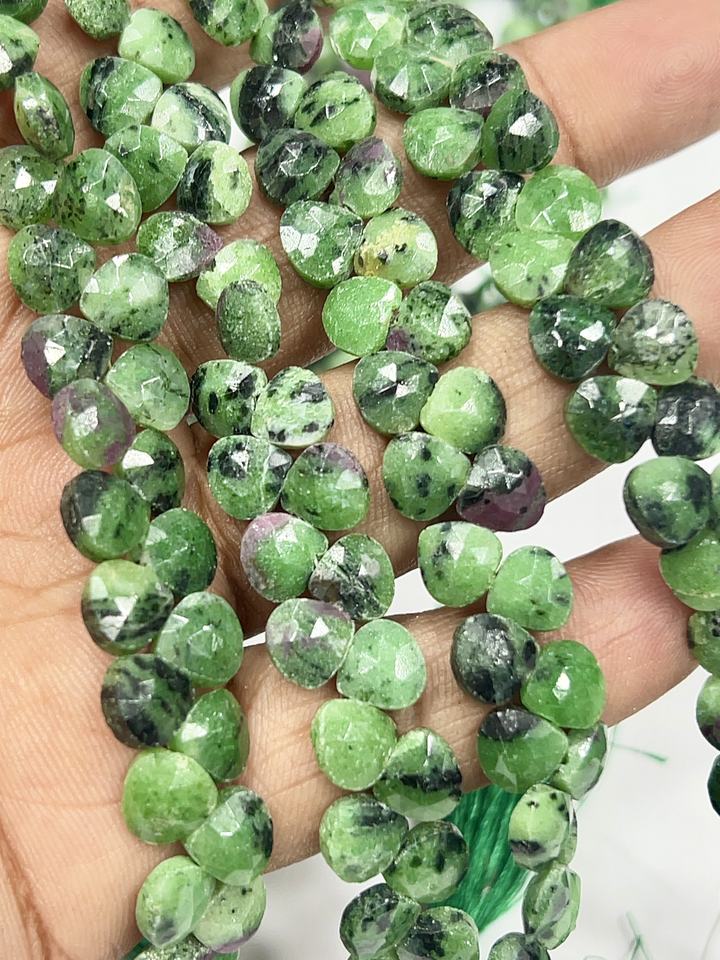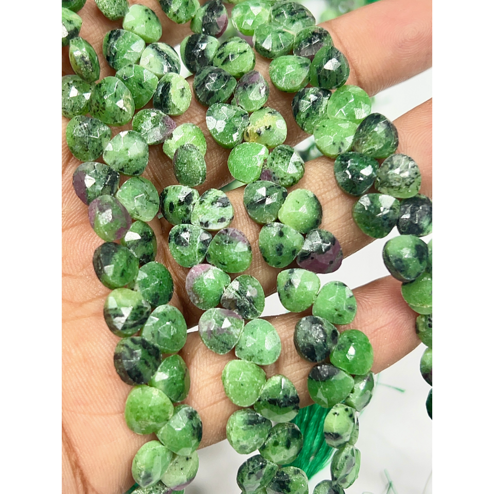 ลูกปัดทรงหัวใจเจียระไนจากหินโซไซต์สีเขียวธรรมชาติ AAA ขนาดประมาณ 6-7 มม. เส้นใยขนาด 8 นิ้ว