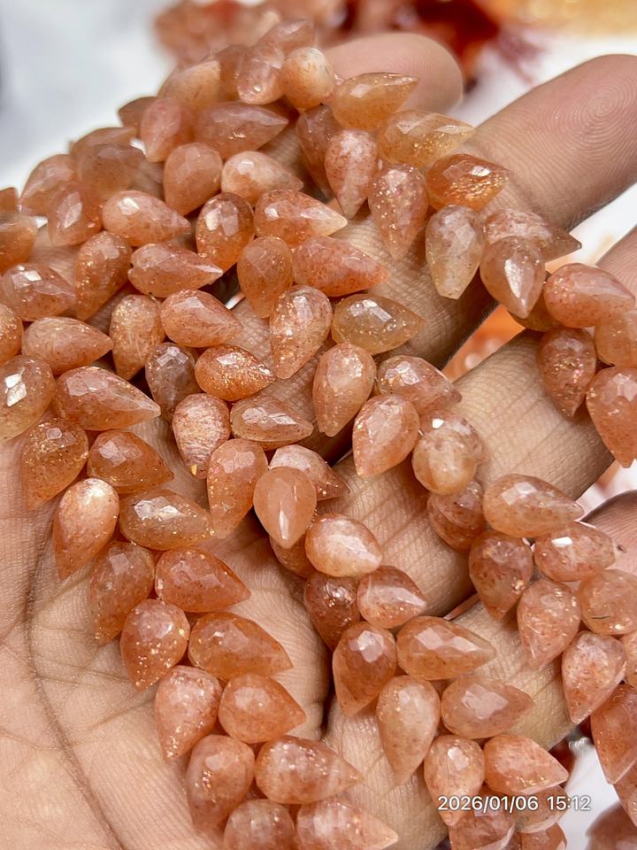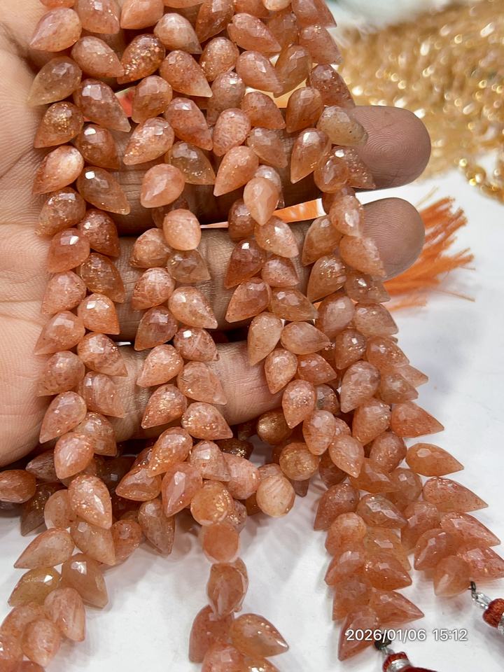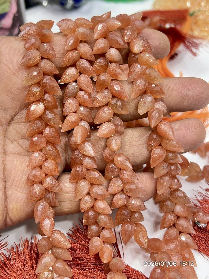 หินซันสโตนสีแดงธรรมชาติทรงหยดน้ำเจียระไนแบบแฟนซี ขนาดประมาณ 6x9 มม. ความยาว 8 นิ้ว