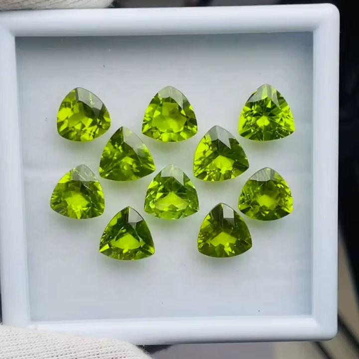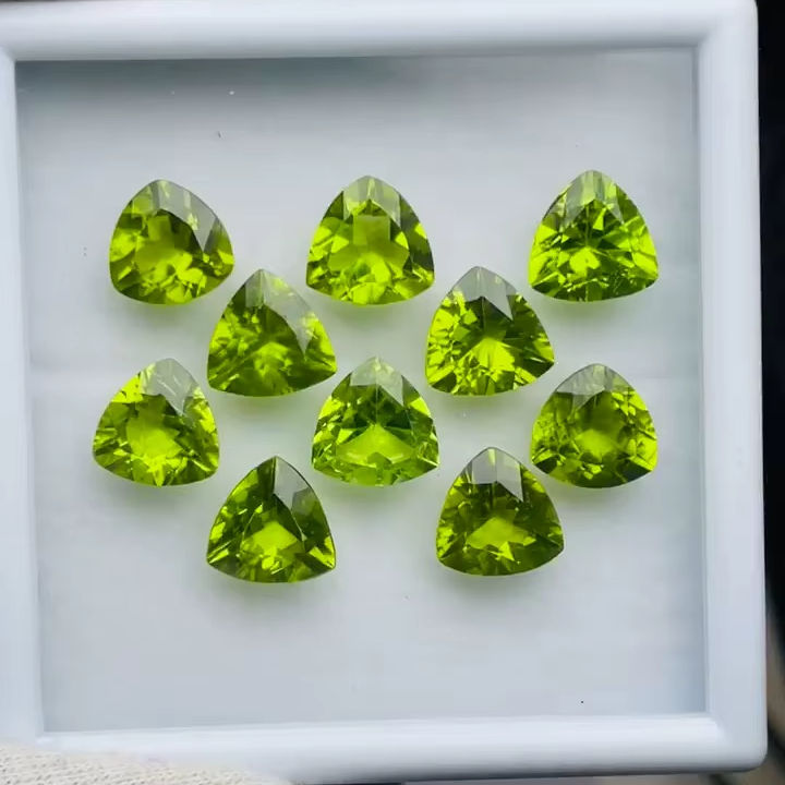 เพอริดอทดิบคุณภาพ AAA ทรงทริลเลียน 10 เม็ด คุณภาพดี มีความเงางามและสีสวยงาม เหมาะสำหรับการขัดและเจียระไน