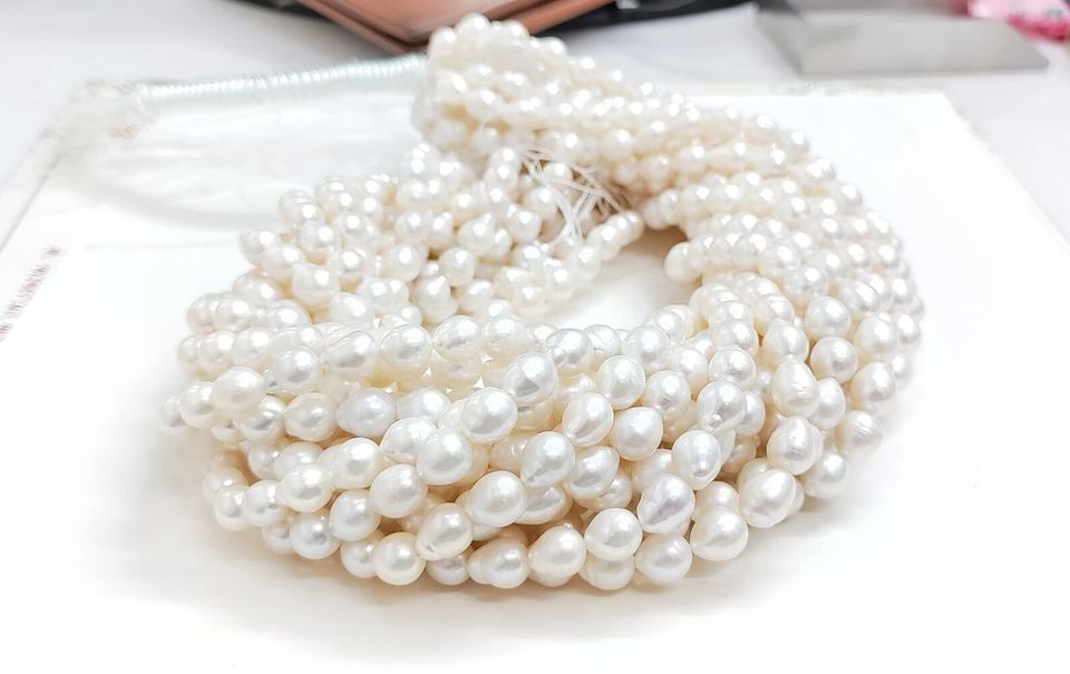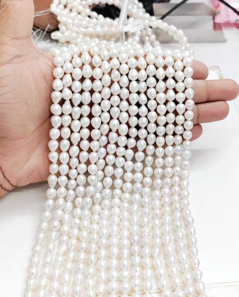 ไข่มุกน้ำจืดทรงหยดน้ำสีขาวธรรมชาติคุณภาพ AAA ขนาด 9*7 มม. ยาว 15.5 นิ้ว สำหรับทำเครื่องประดับ