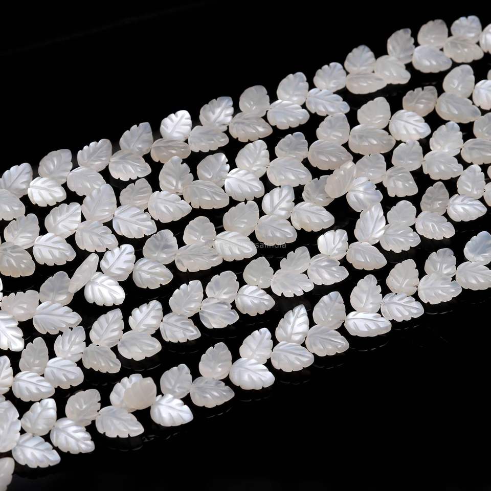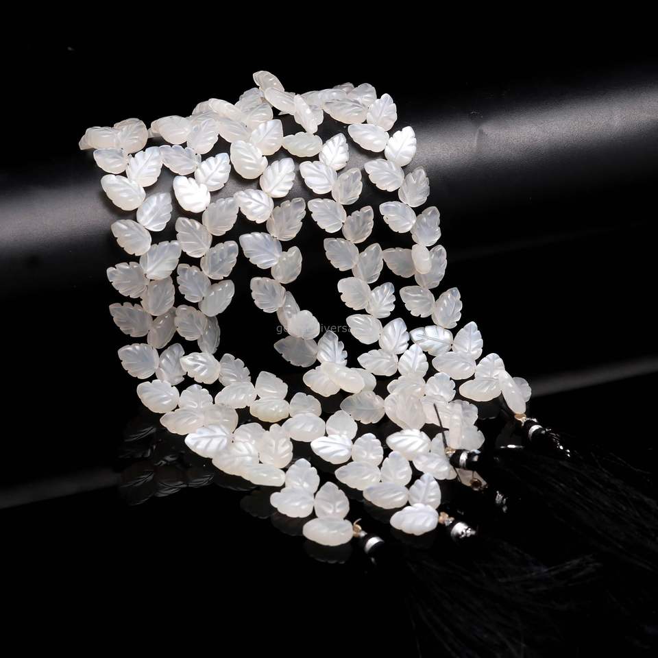 ลูกปัดหินมูนสโตนสีขาวธรรมชาติ แกะสลักรูปใบไม้
