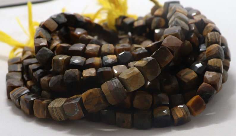 ลูกปัดไทเกอร์อายสีเหลืองทรงลูกบาศก์เหลี่ยมเพชรพลอยขนาด 8-9 มม. ลูกปัดไทเกอร์อายทรงกล่อง 3 มิติ ขนาด 8 นิ้ว สำหรับทำเครื่องประดับ