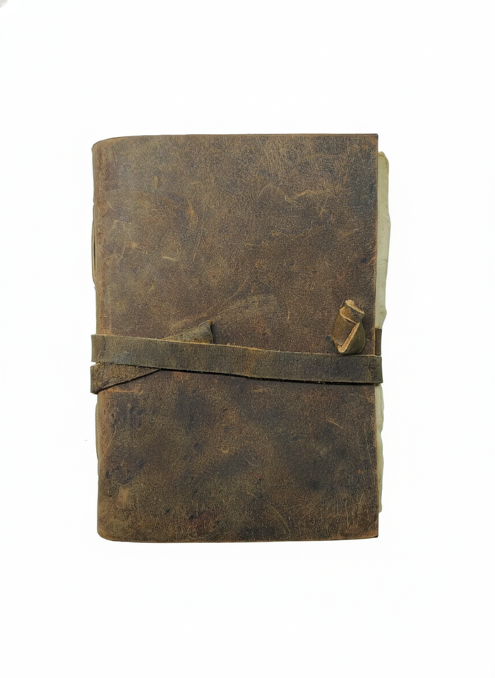 Genuine leather cover with leather wrap strap and paper inner pagesMaterial