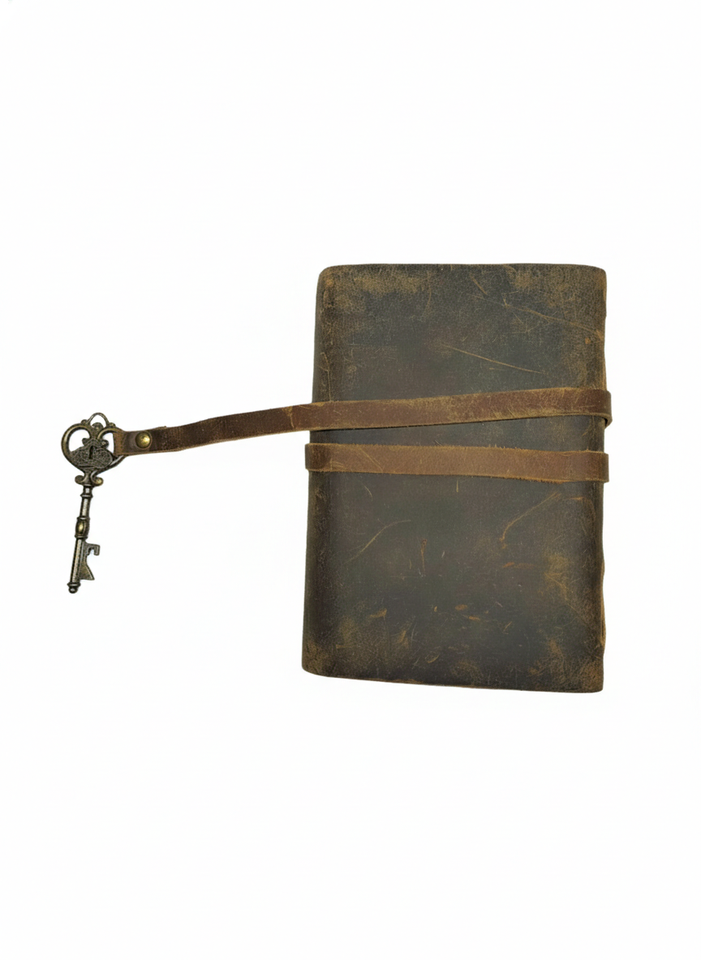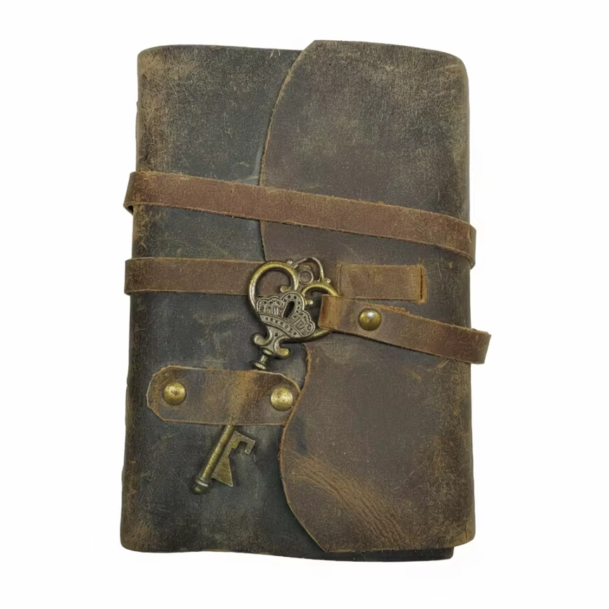Genuine distressed leather cover with metal lock and paper sheets