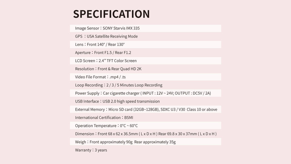 Bluetooth, Night Vision, WDR, Loop recordingFunction