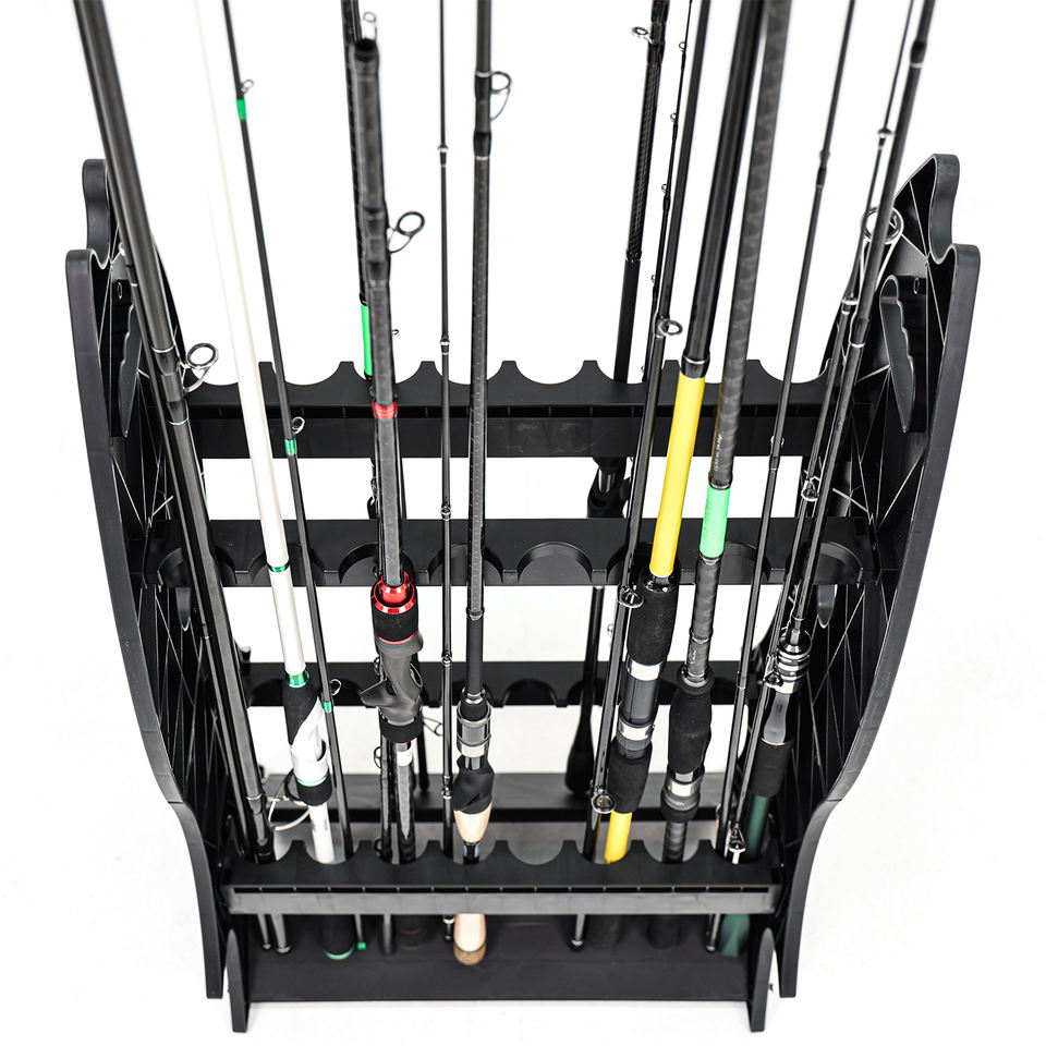 ชั้นวางคันเบ็ดแบบตั้งพื้น ABS ทนทาน รองรับคันเบ็ดได้ 16 คัน ดีไซน์กะทัดรัด แผงด้านข้างรูปทรงปลา