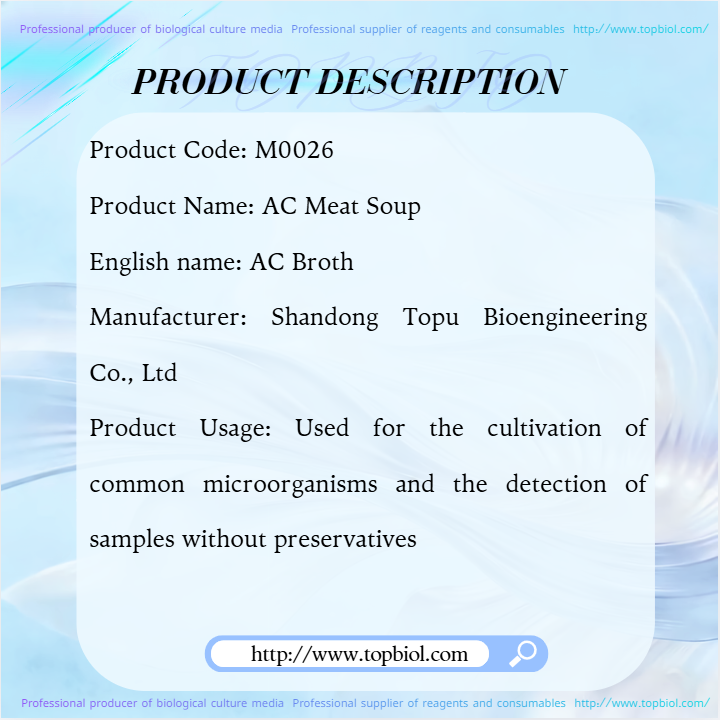 น้ำซุปเชื้อจุลินทรีย์ชนิด AC ใช้สำหรับการเพาะเลี้ยงจุลินทรีย์ทั่วไปและการตรวจตัวอย่างที่ไม่มีสารกันบูด