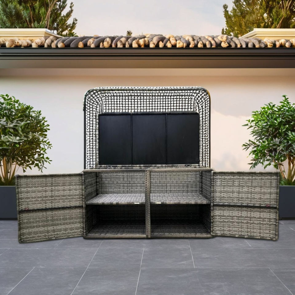 ชุดเฟอร์นิเจอร์กลางแจ้งทันสมัย AC00031 สำหรับสวน ทนทานทุกสภาพอากาศ โครงอะลูมิเนียมหวายสีเทา พร้อมกล่องเก็บของตกแต่ง สำหรับลานบ้านและวิลล่า