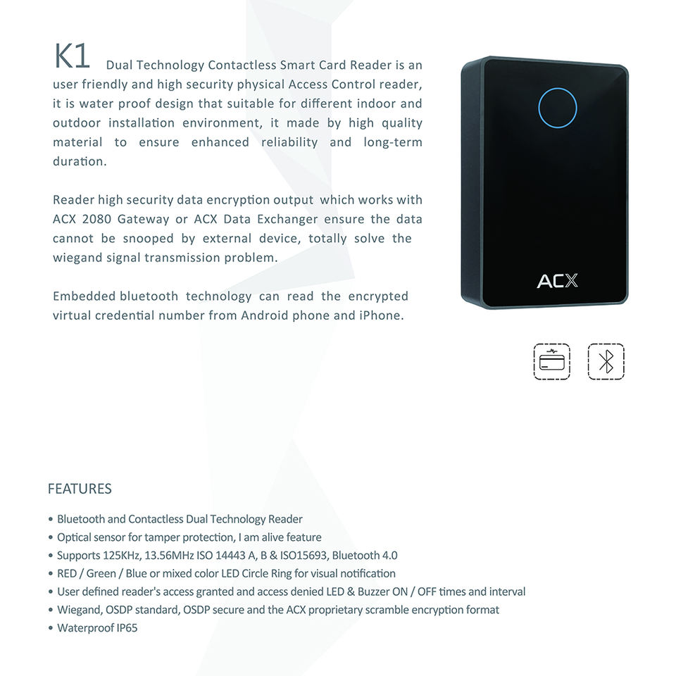 ACX เครื่องอ่านการเข้าถึงทางกายภาพ K Series K1บลูทูธกันน้ำและเครื่องอ่านบัตรสมาร์ทสัมผัส