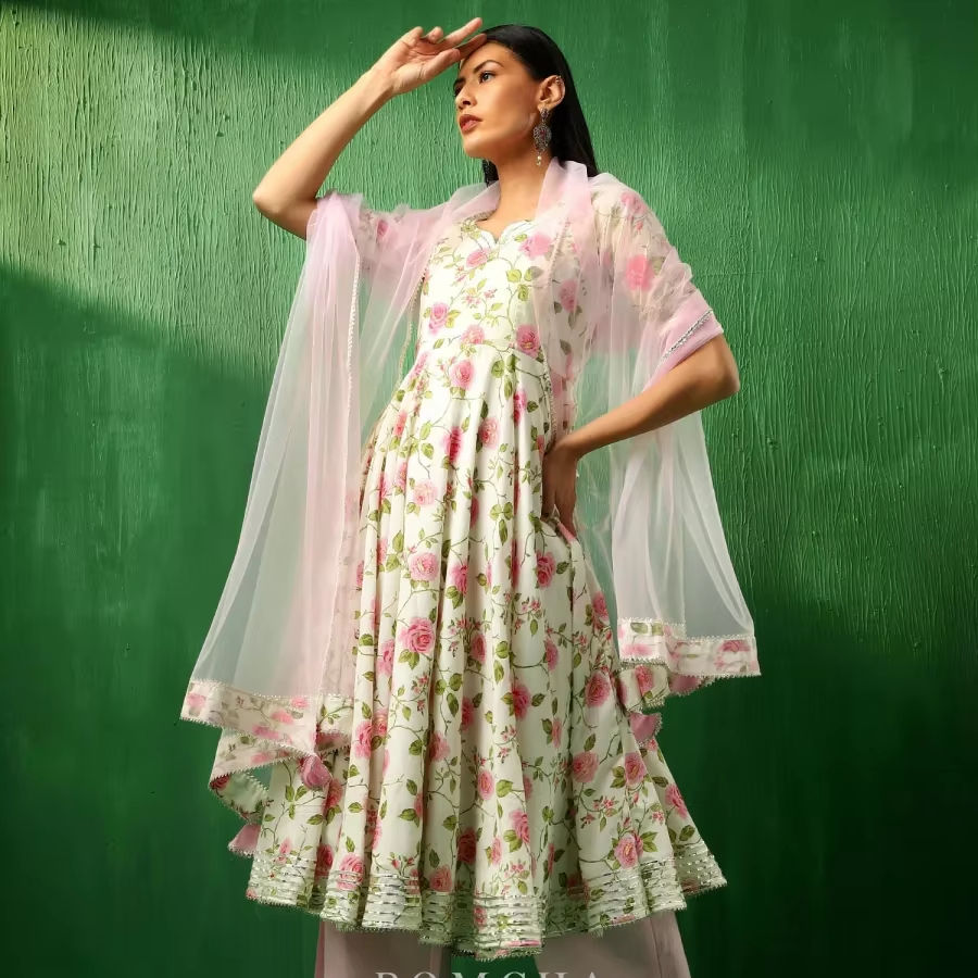 ชุดอนาคาลีผ้าฝ้ายลายดอกกุหลาบสีชมพูพร้อมตาข่ายผ้านิ่มพิมพ์ลายดอกไม้งานพิมพ์ลายดอกไม้ผ้าคอตตอนแท้พร้อมกางเกง & dupatta