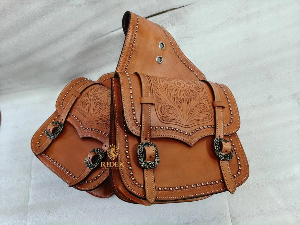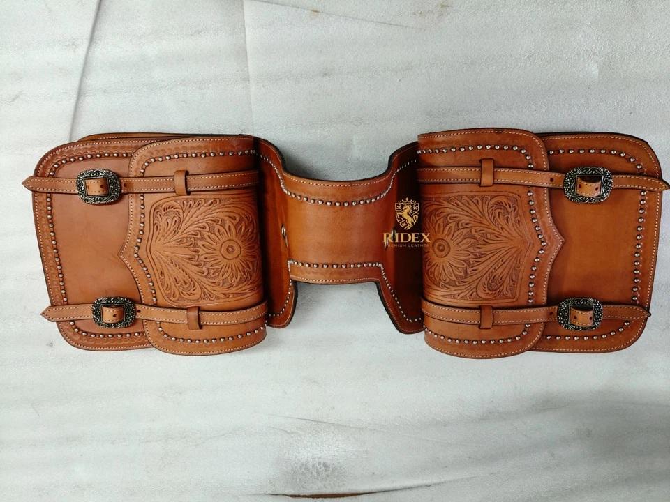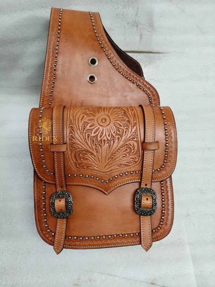 ADEEFA Leather Western Saddle Bag With Floral Hand Made Tooled for Trail Riding Camping and Outdoor Equestrian Storage.
