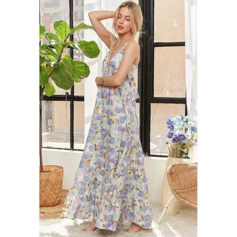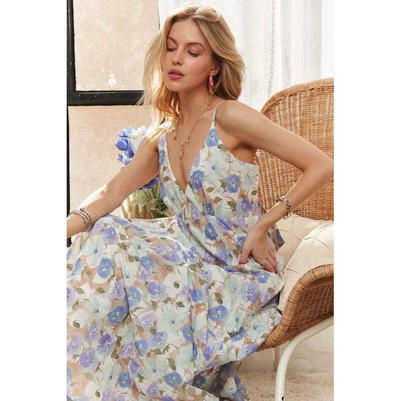 ADORA ชุดเดรสลายดอกไม้พร้อมโบว์ด้านหลัง /สีฟ้า ไซส์ S รุ่นทำมือ