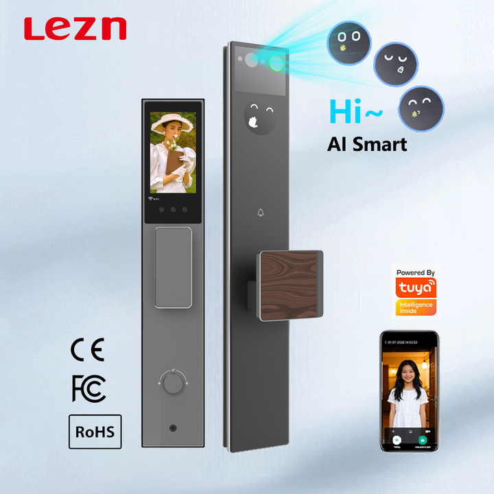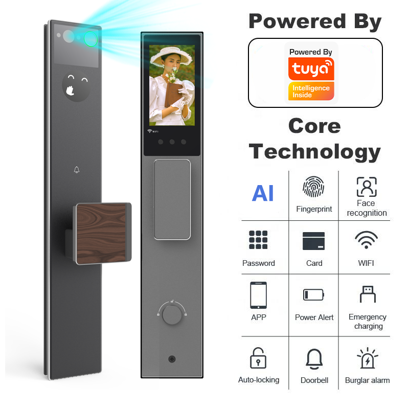 ระบบล็อคอัจฉริยะควบคุมด้วยเสียง AI พร้อมกล้องอินเตอร์คอมสำหรับประตูไม้ รองรับการปลดล็อคด้วยใบหน้า ลายนิ้วมือ รหัสผ่าน ควบคุมระยะไกลผ่านแอป Tuya