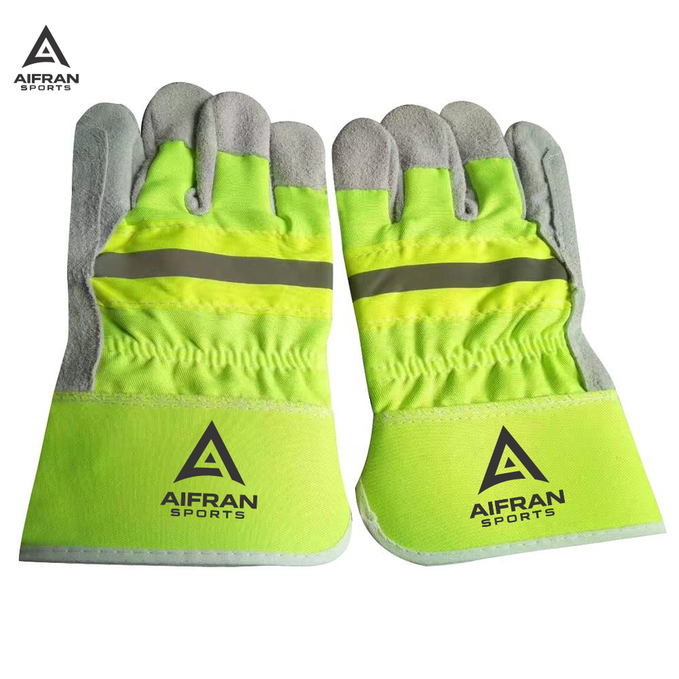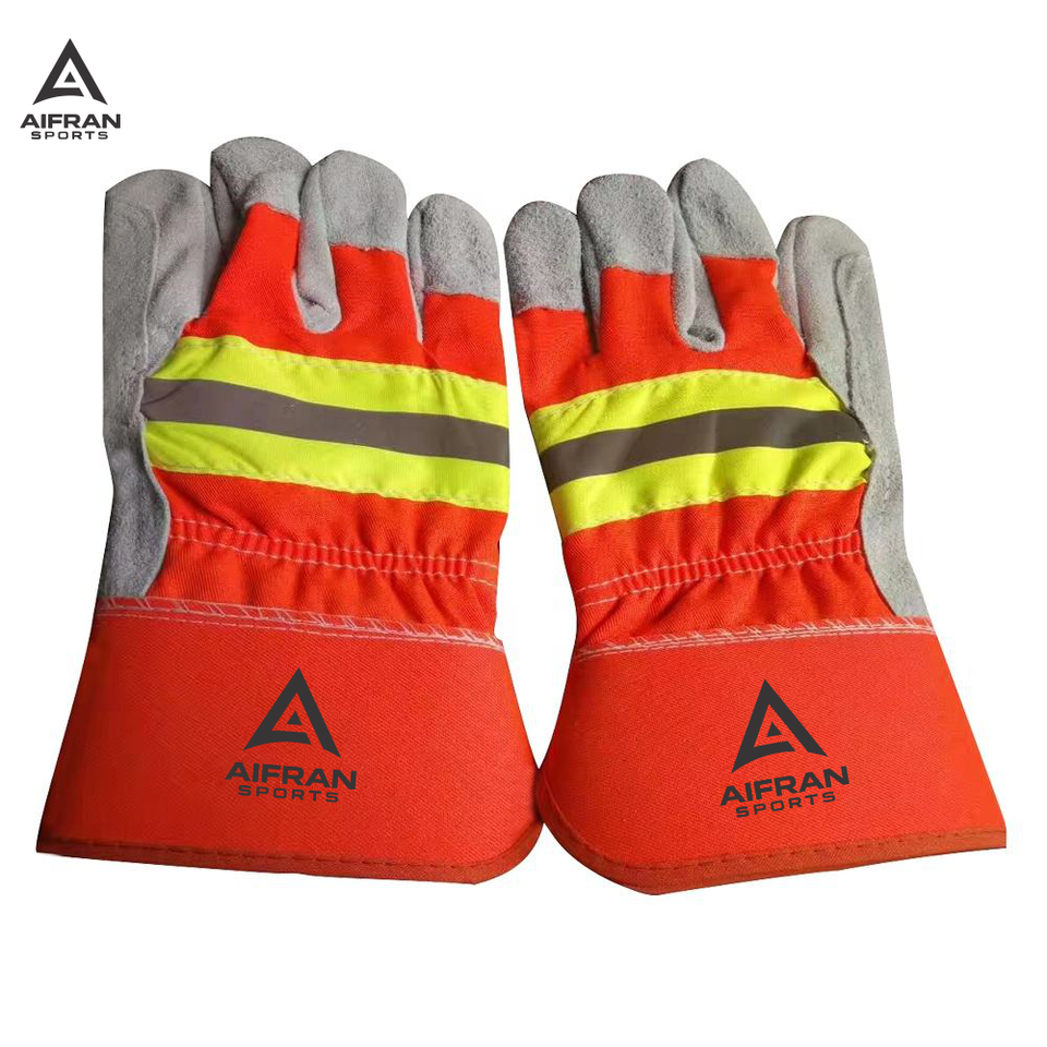 ถุงมือจราจรสีส้มสะท้อนแสง AIFRAN ถุงมือทำงานนิรภัยหนังวัวแท้ แถบสะท้อนแสง ทนไฟ ขายส่ง