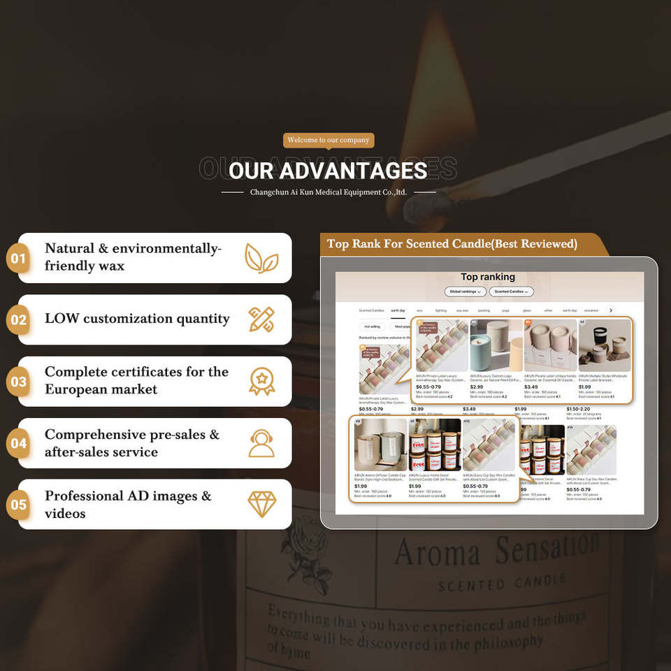 เทียนหอมถั่วเหลือง AIKUN แบบเทด้วยมือ พร้อมโลโก้และขวดแบบกำหนดเอง สำหรับการทำสมาธิและการตกแต่งบ้าน