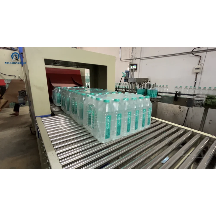 เครื่องห่อฟิล์มหดแบบรางเดี่ยวอัตโนมัติเต็มรูปแบบ AIM TECHNOLOGIES ผลิตจากสแตนเลสและพลาสติก กำลัง 3 แรงม้า ความเร็ว 90-120 ชิ้น/นาที