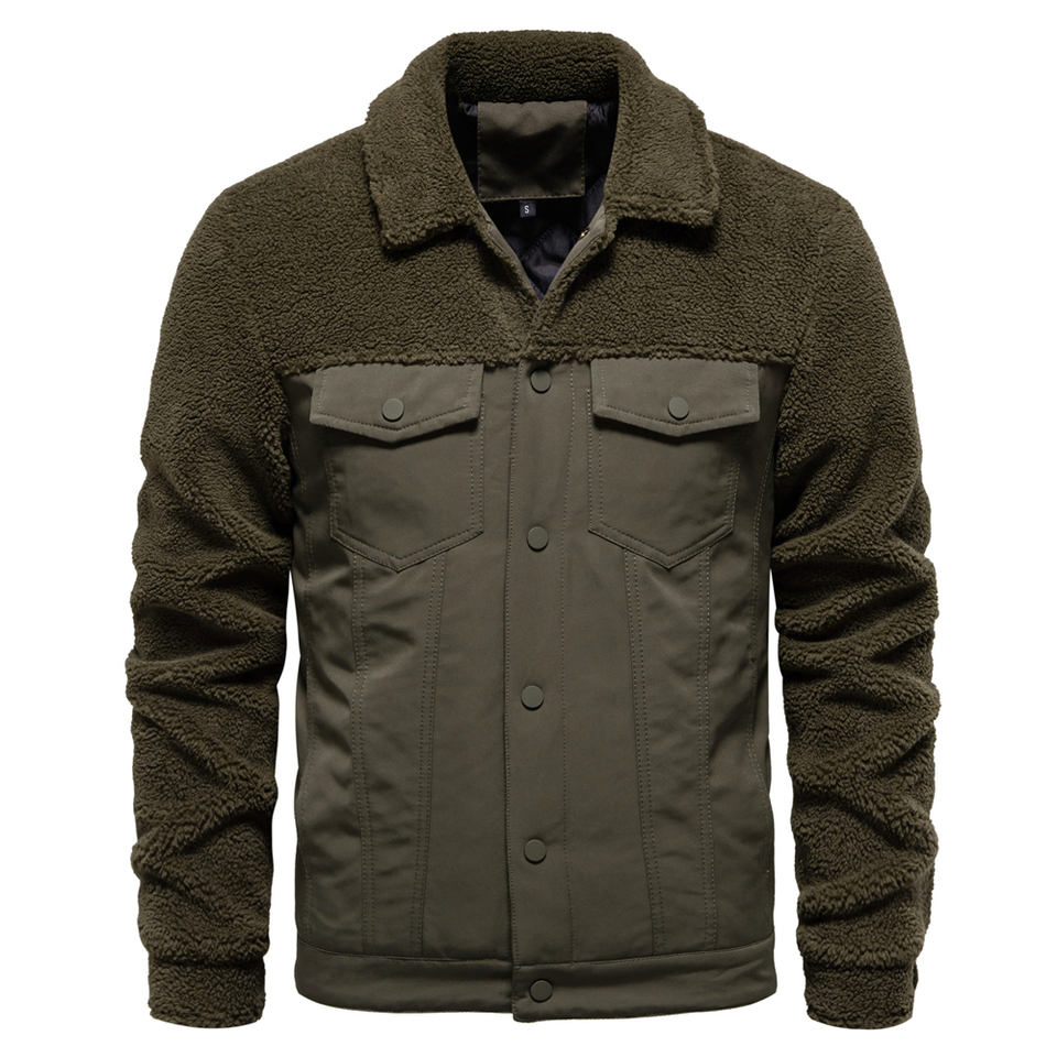 Aiopeson แจ็คเก็ตผ้าฟลีซสำหรับผู้ชาย, แจ็คเก็ตผ้าหนาอบอุ่นมีปกขนสัตว์ปะติดเสื้อแจ็คเก็ตทำงานแฟชั่นลำลองสีกากีขนาดยุโรป JK815-Khaki