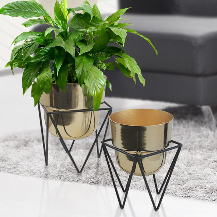 AK ชุดปลูกต้นไม้ทรงกลมทำจากโลหะทองเหลือง2ชิ้นสีทองพร้อมกระถางทรงกลมตั้งสีดำสำหรับตกแต่งคาเฟ่/ของตกแต่งบ้าน
