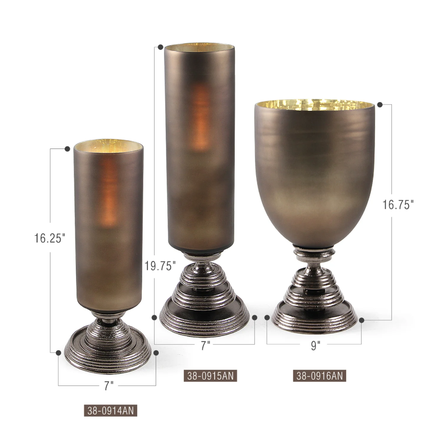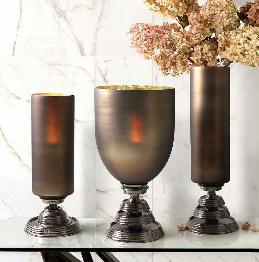 AK Brass Modern Design Metal Flower Vase In Silver Antique Finished Base With Top Glass For Cafe Interior Decor / Home Decor