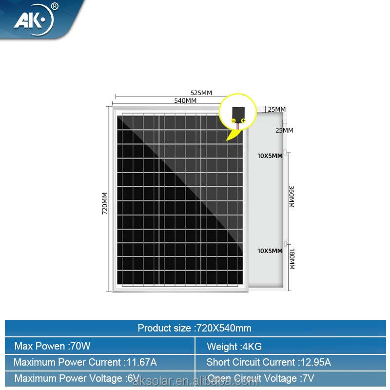 AK แก้วกระจกแผงโซลาร์เซลล์ขนาด70W 6V 18V 36V กรอบอะลูมิเนียมชุบอโนไดซ์ประสิทธิภาพ22% CE ROHS 3.2mm ทำจากเหล็กต่ำ