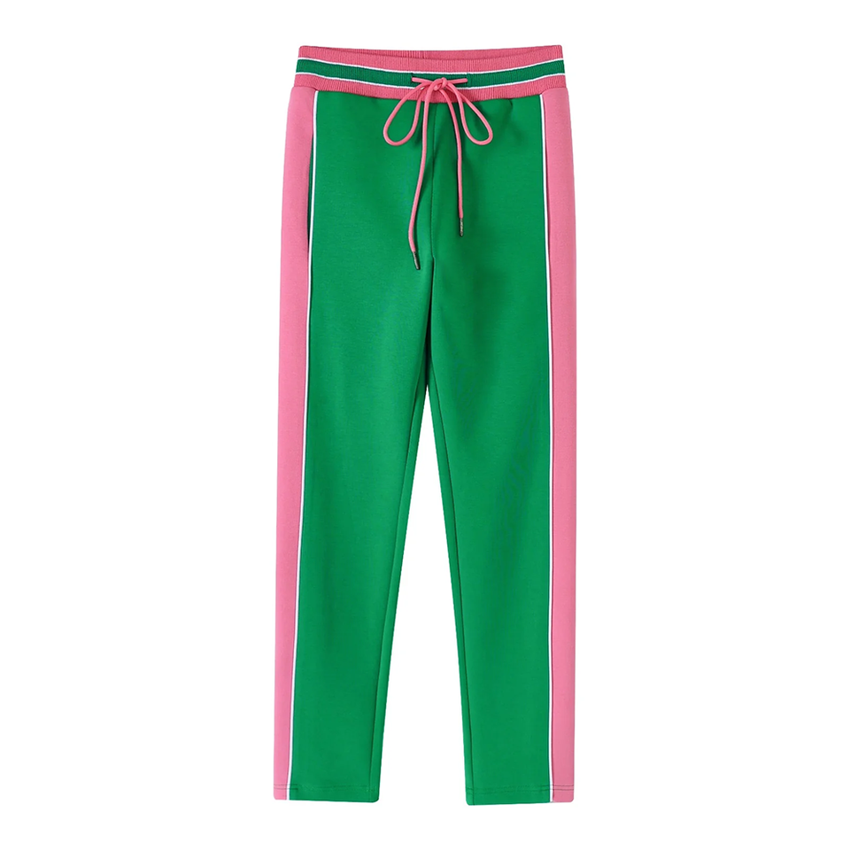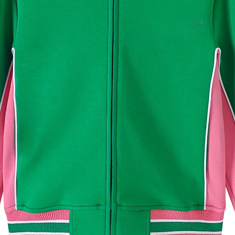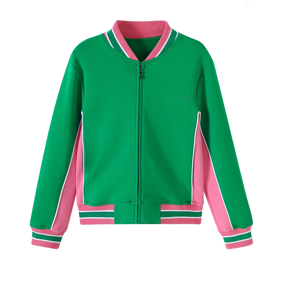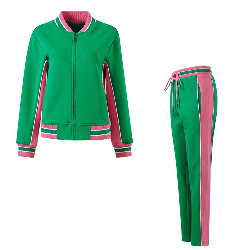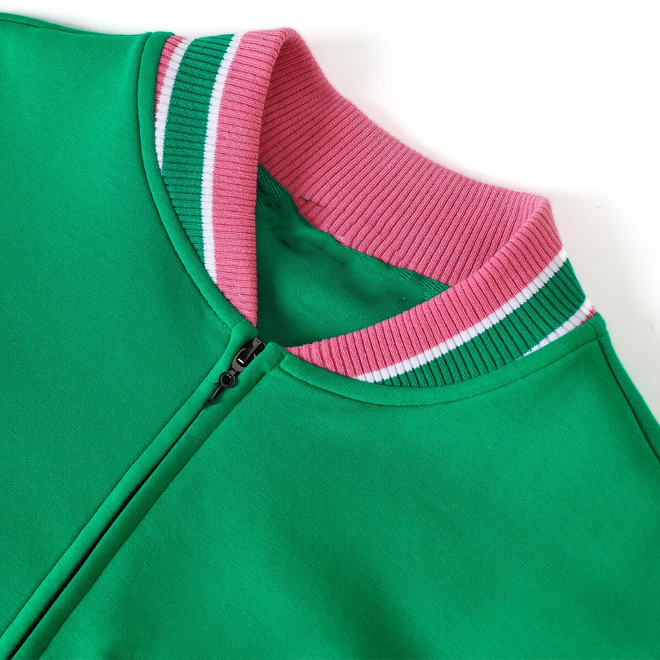 ชุดวอร์มลำลองสีเขียวชมพูแบบมีซิปเต็มตัว แจ็คเก็ตบอมเบอร์ผ้าฟลีซทรงวาร์ซิตี้ กางเกงจ็อกเกอร์ทรงสอบเข้ารูป ผ้าฝ้าย 100% ให้ความอบอุ่นและสวมใส่สบาย