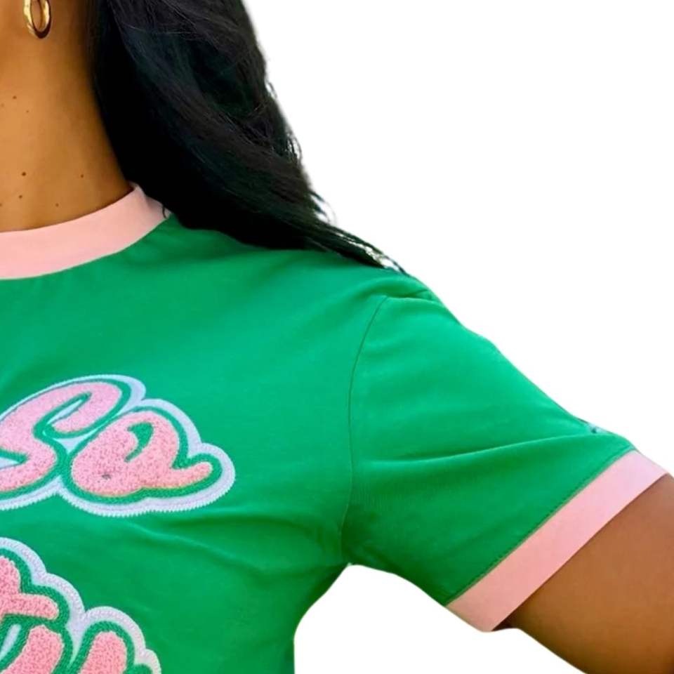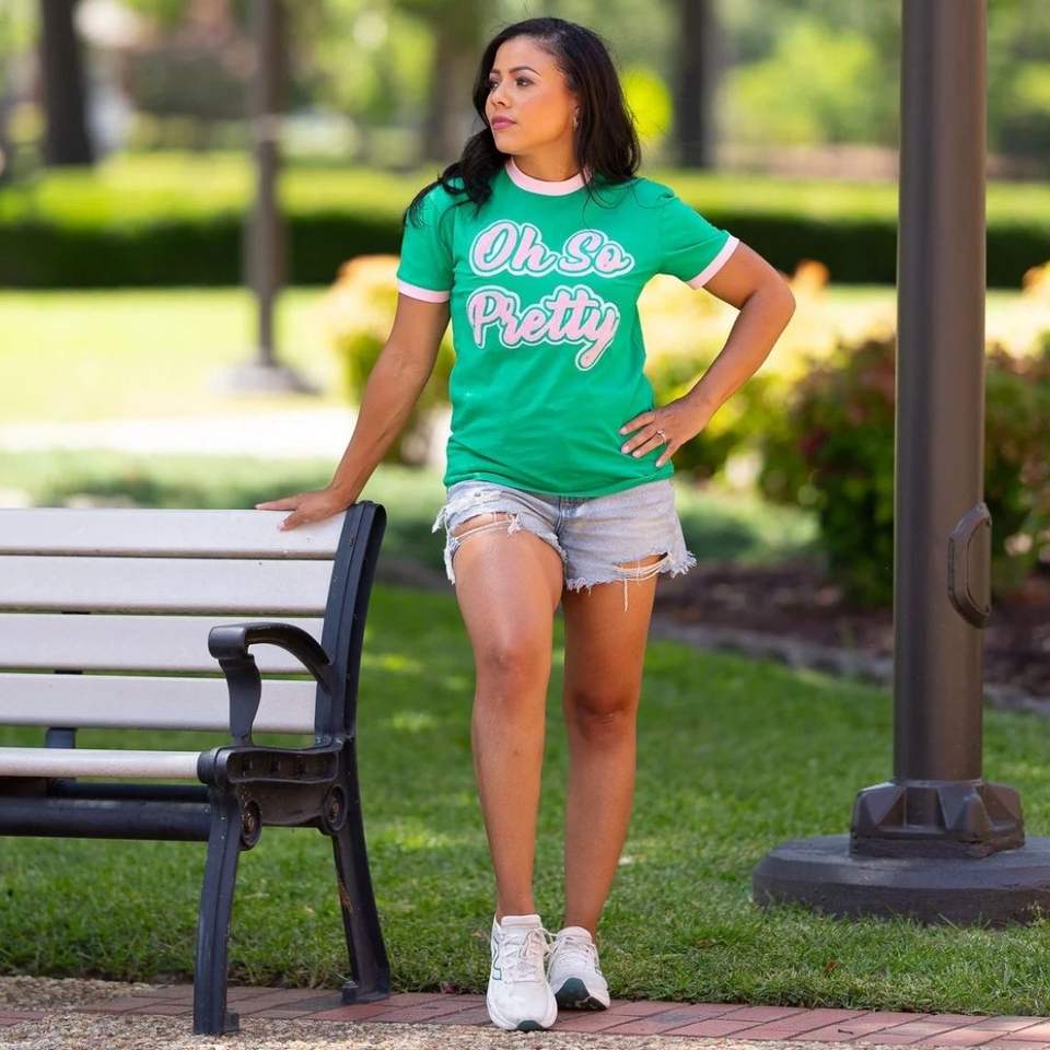 เสื้อยืดโอเวอร์ไซส์ AKA Oh So Pretty สำหรับผู้หญิง ลายตัวอักษรกรีก สไตล์ริงเกอร์ ผ้าฝ้ายพรีเมียม ใส่สบาย ทันสมัย