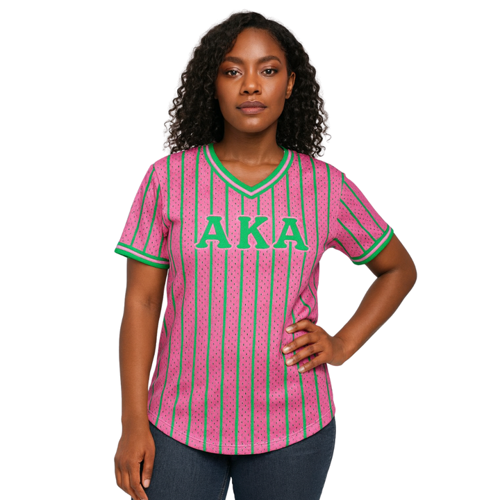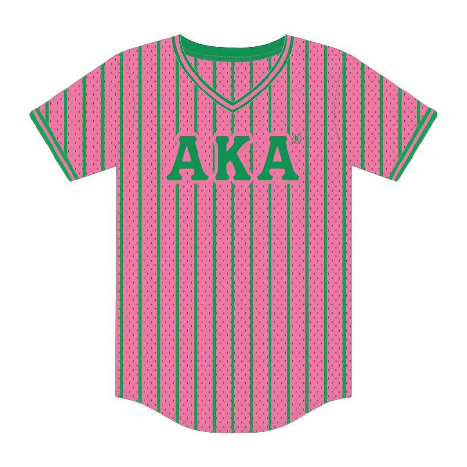 AKA Pink Pinstripe Pullover Baseball Jersey 100% Polyester Mesh Sorority Apparel V Neck T Shirt Embroidered Applique Logos