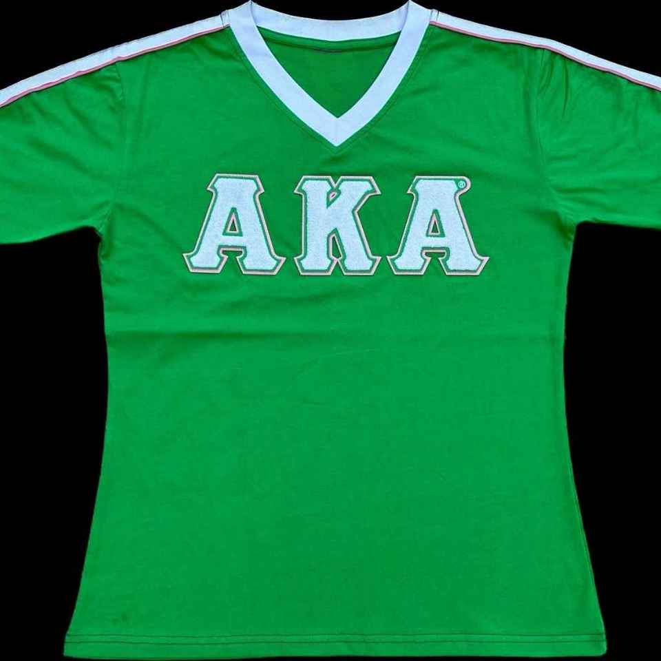 เสื้อยืดคอวี AKA Premium Chenille Ringer สำหรับผู้หญิง ปักลายตัวอักษรกรีก แต่งขอบตัดกัน คอวี คุณภาพสูง เสื้อลำลอง