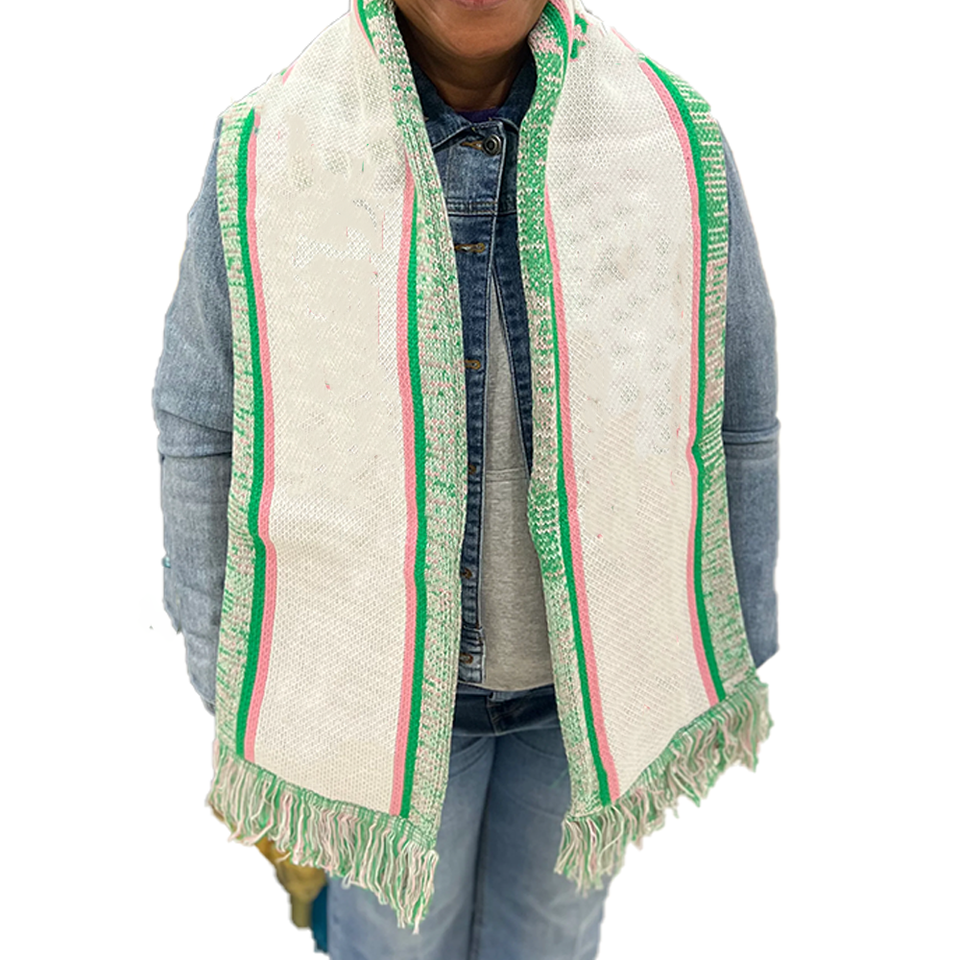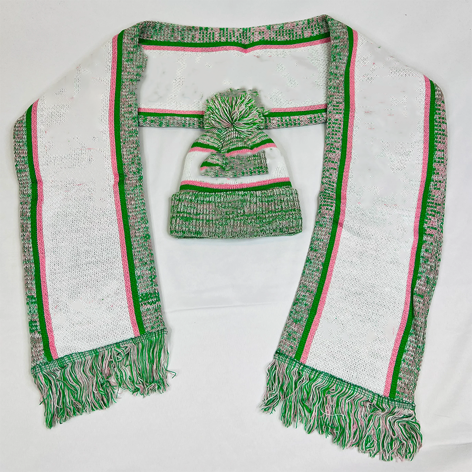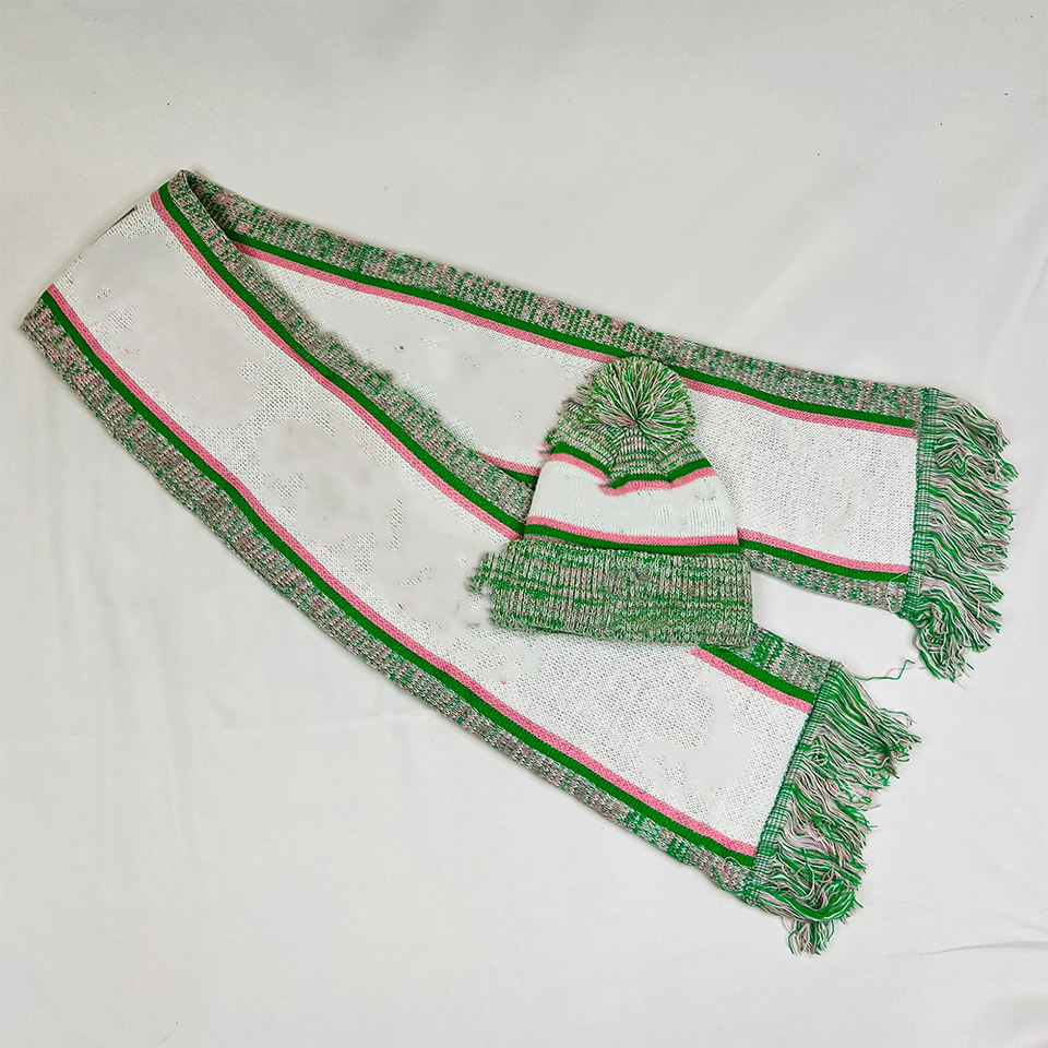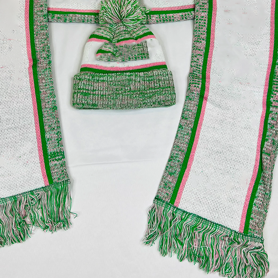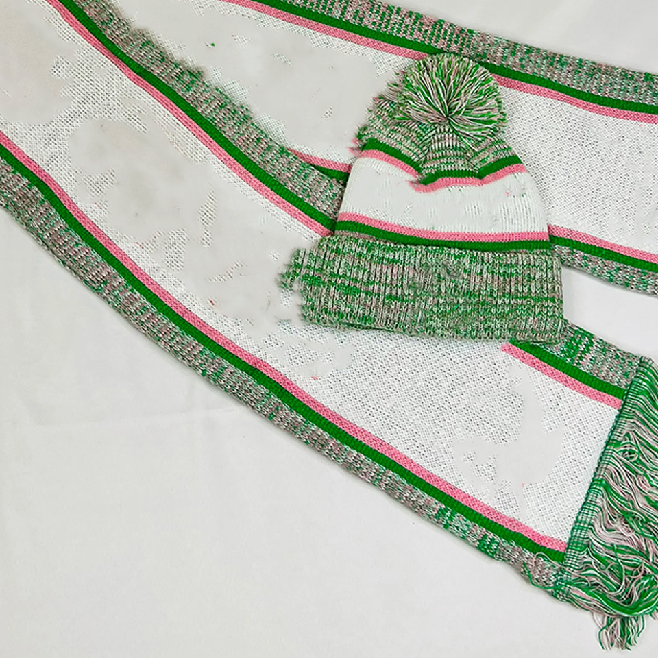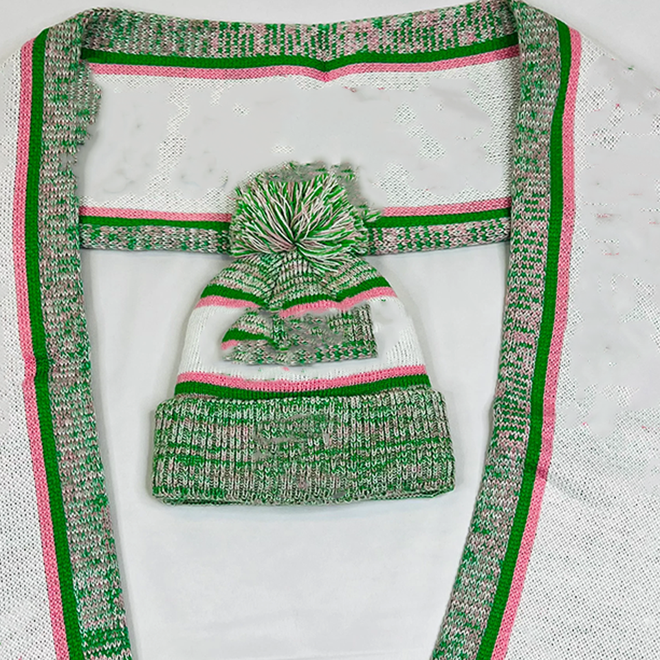 AKA ชุดหมวกบีนนี่ปอมปอมปอมพร้อมสีเขียวแอปเปิ้ลลายทางชุด100% อะคริลิคสำหรับฤดูหนาวสีขาวพรีเมี่ยม