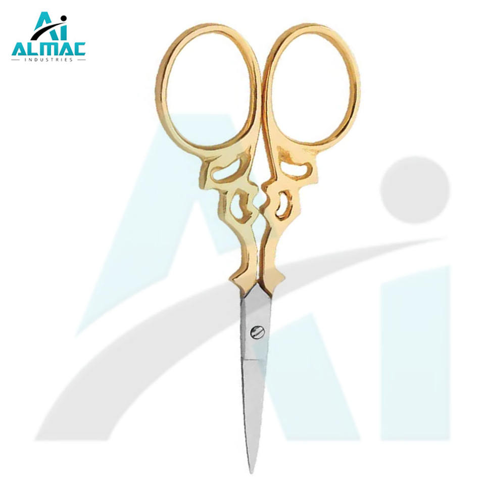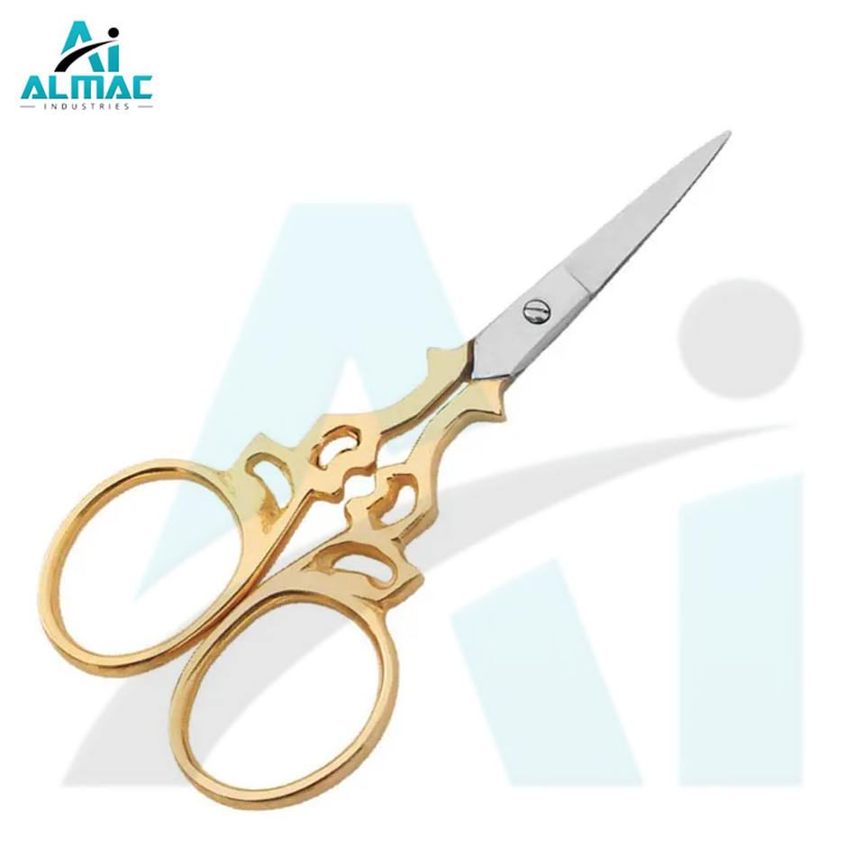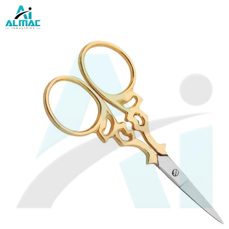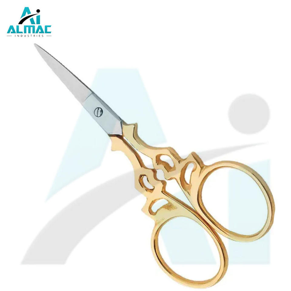 Almac กรรไกรสแตนเลสสตีลน้ำหนักเบาสีทองแบบแฟนซีใบมีดคมพร้อมเข็มใช้งานสะดวกสบายขนาดเล็กสำหรับงานอุตสาหกรรม