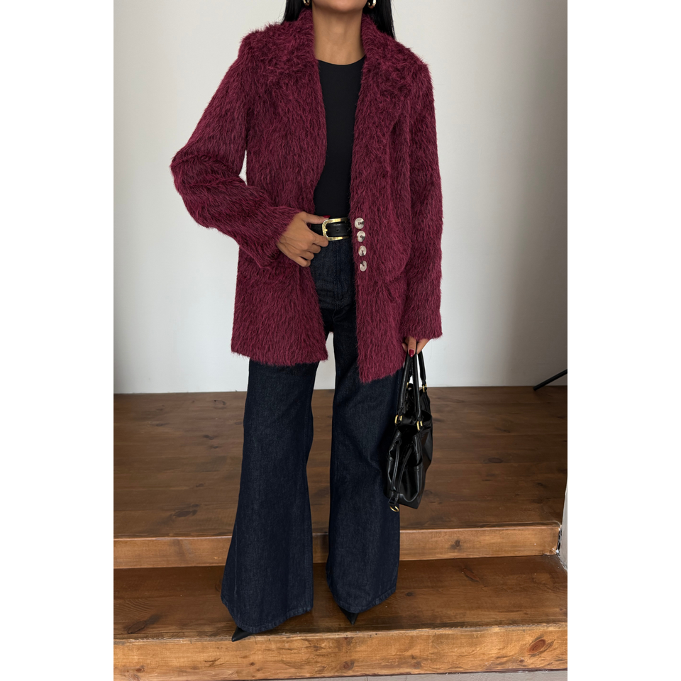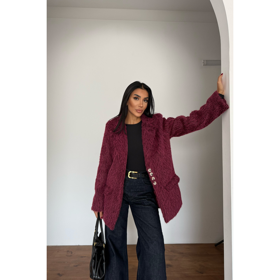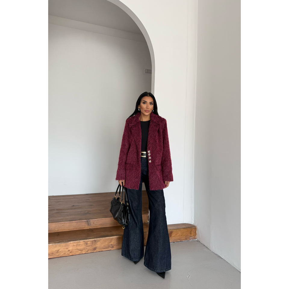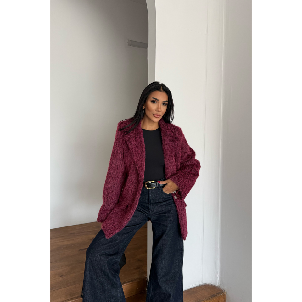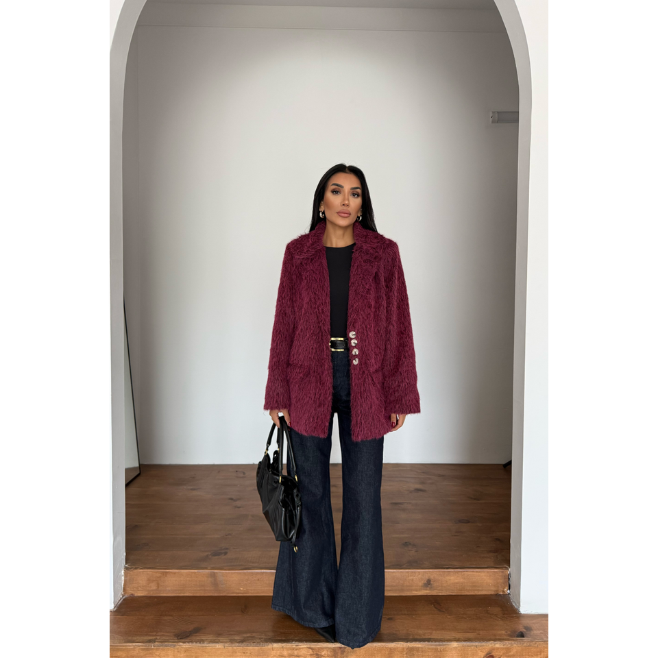 เสื้อแจ็คเก็ตลายอัลปาก้าทรงบอยเฟรนด์สำหรับผู้หญิง สีบอร์โดซ์