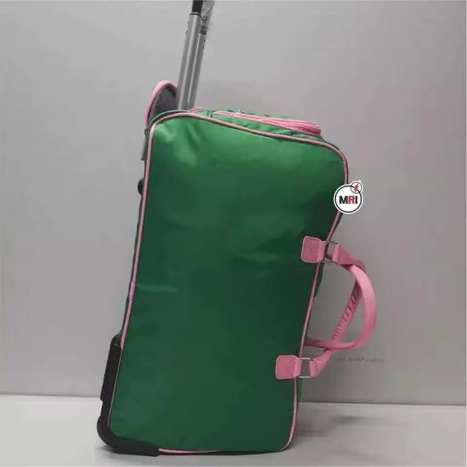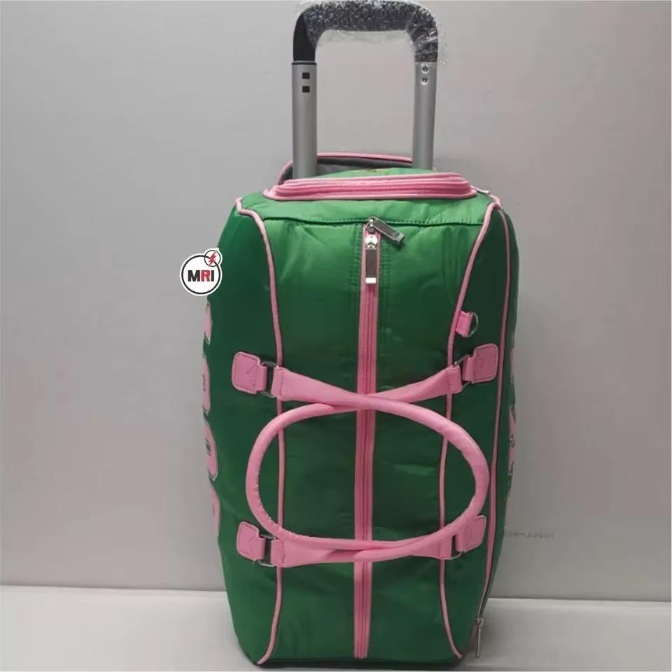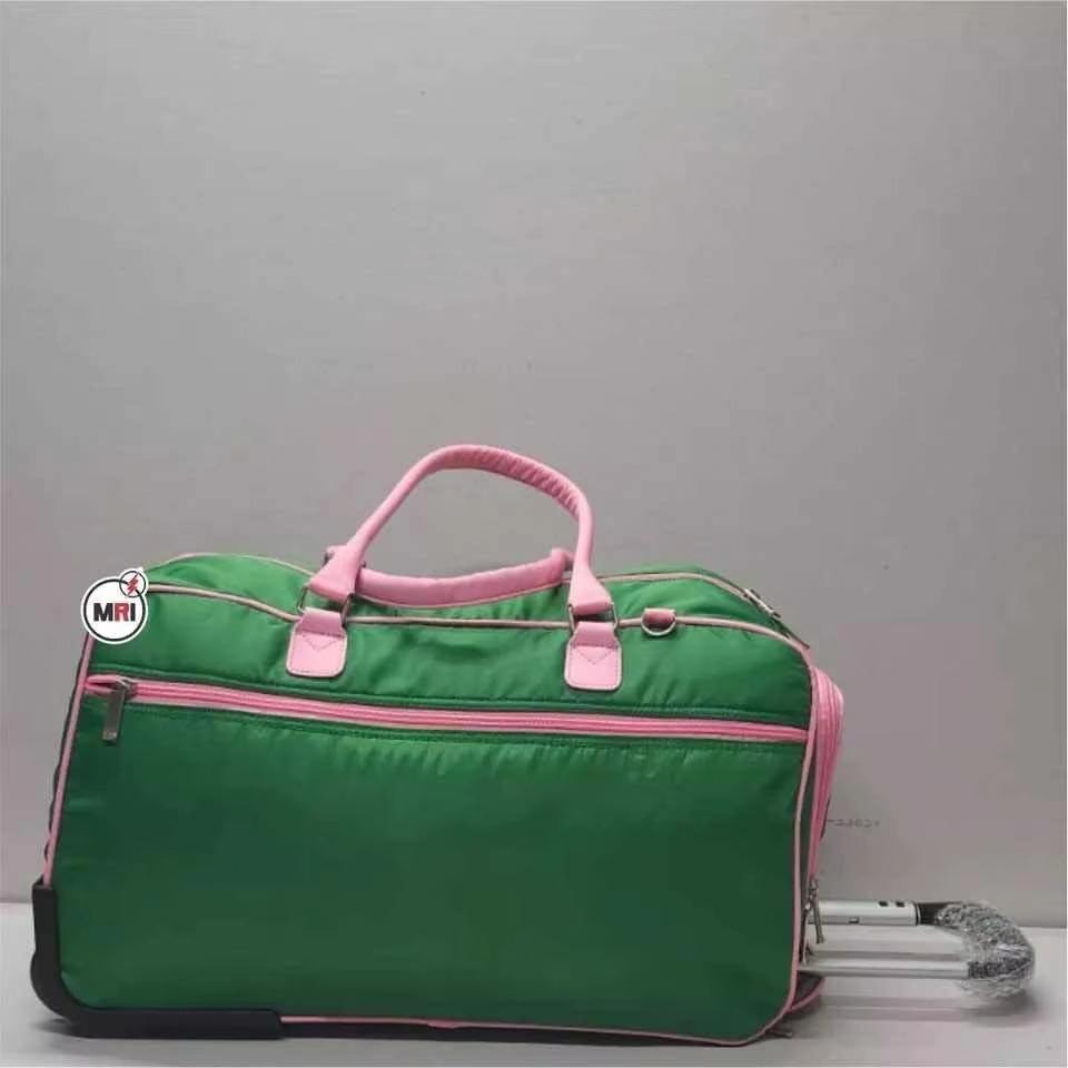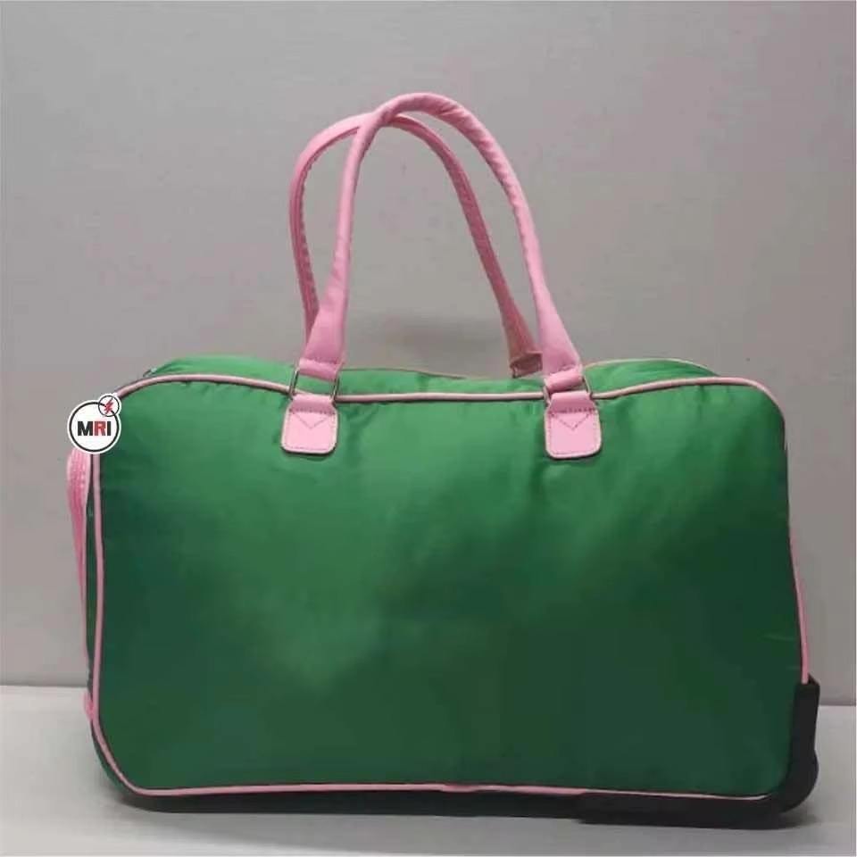 กระเป๋าล้อลาก ALPHA KAPA ALPHA สำหรับชมรมนักศึกษา กระเป๋าล้อลากแบบกรีก สีเขียวและชมพู พร้อมขั้นต่ำในการสั่งซื้อน้อย