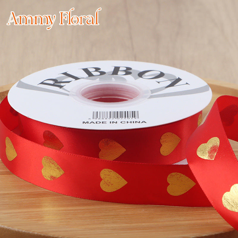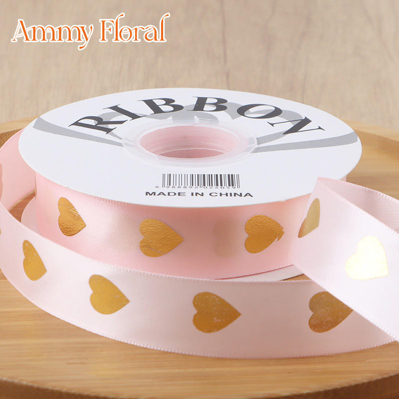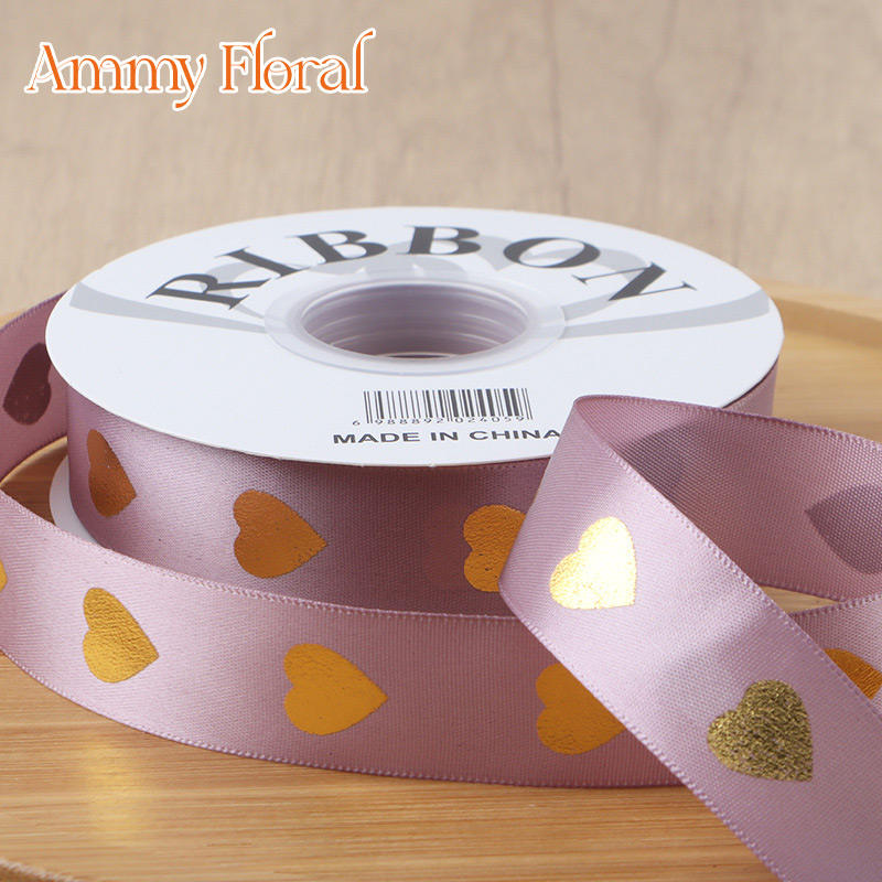 ริบบิ้นโพลีเอสเตอร์เคลือบทองคำ 2.5 ซม. รุ่น AM-RP024 สำหรับตกแต่งงานแต่งงาน วันวาเลนไทน์ ลายดอกไม้ สวยงาม เหมาะสำหรับตกแต่งเค้ก