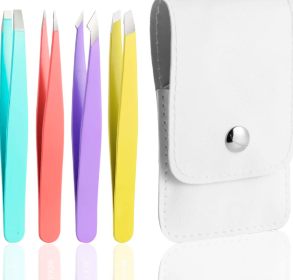 Anaif ชุด4ชิ้นชุดที่คีบคิ้วแบบผงเคลือบคิ้วแหนบปลายตรงพร้อมเคสหนัง PU สีขาวสำหรับกำจัดขน