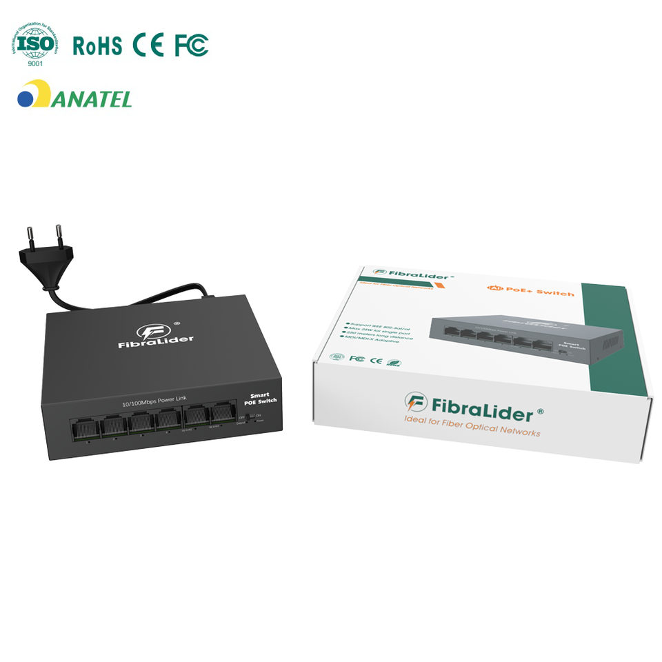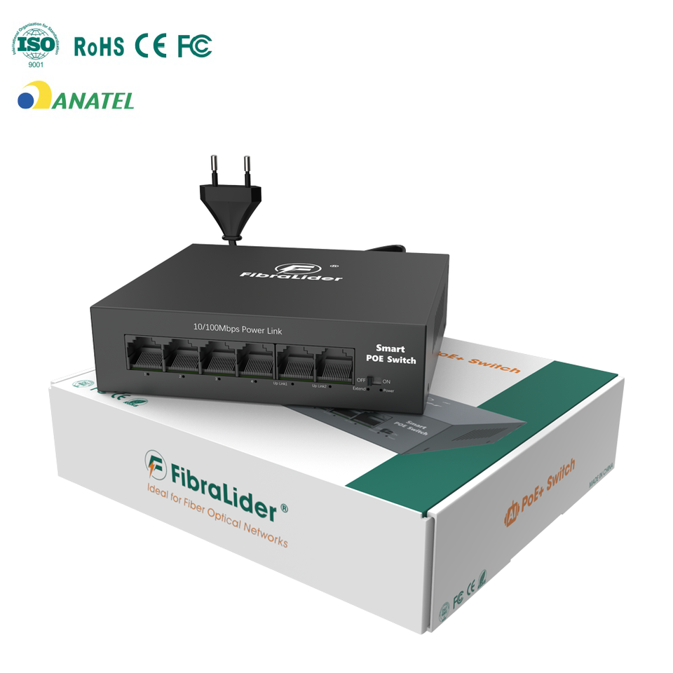 สวิตช์ PoE 6 พอร์ต ANATEL 10/100Mbps 4+2 พอร์ตอัปลิงค์ 48V 30W/พอร์ต ความเร็ว 1.2Gbps รองรับมาตรฐาน IEEE802.3af/at สำหรับเครือข่ายกล้องวงจรปิด
