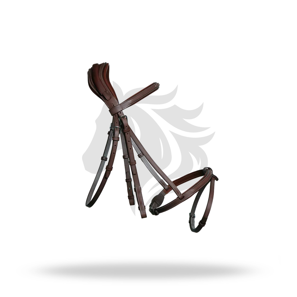 บังเหียนแบบฝรั่งเศสทรง Anatomical พร้อมสายรัดจมูกแบบแฟนซี ตกแต่งด้วยการเย็บอย่างประณีต ขนาดมาตรฐานสำหรับม้า ให้ความสบายในการขี่