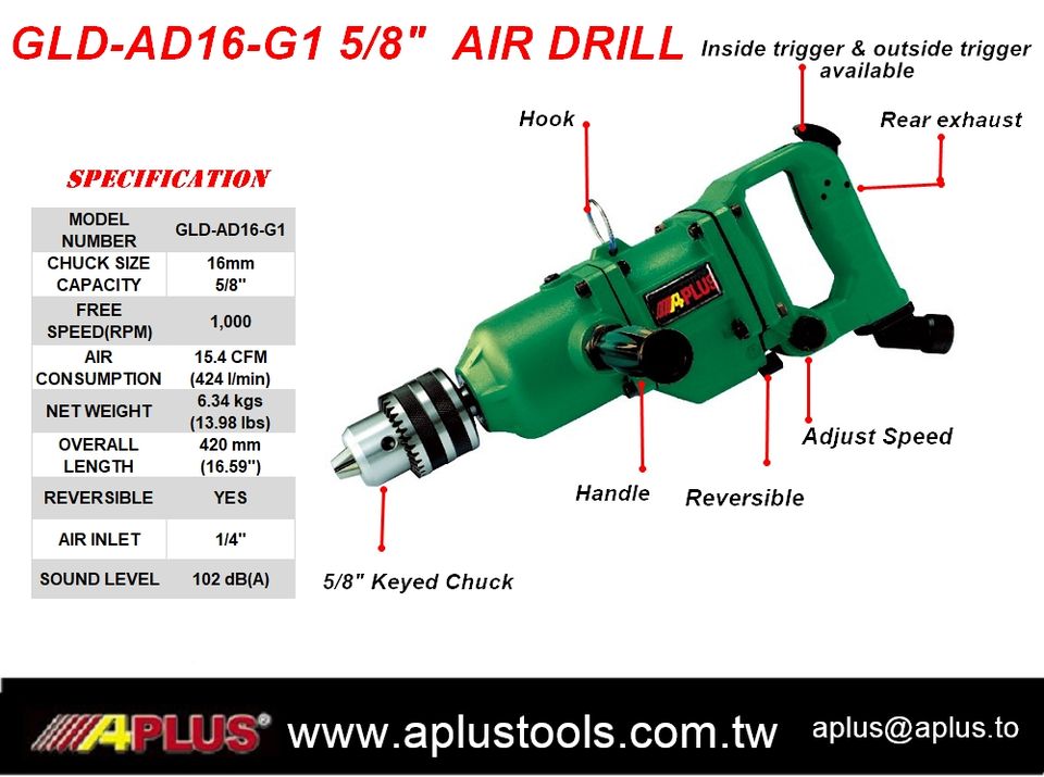 สว่านลมตรง APLUS GLD-D16-G1Z ขนาด 5/8 นิ้ว หัวจับดอกสว่านสีเขียว ความเร็ว 1000 รอบต่อนาที ระบายอากาศด้านข้าง แบบย้อนกลับได้ พร้อมด้ามจับ OEM ISO9001 424 ลิตร/นาที