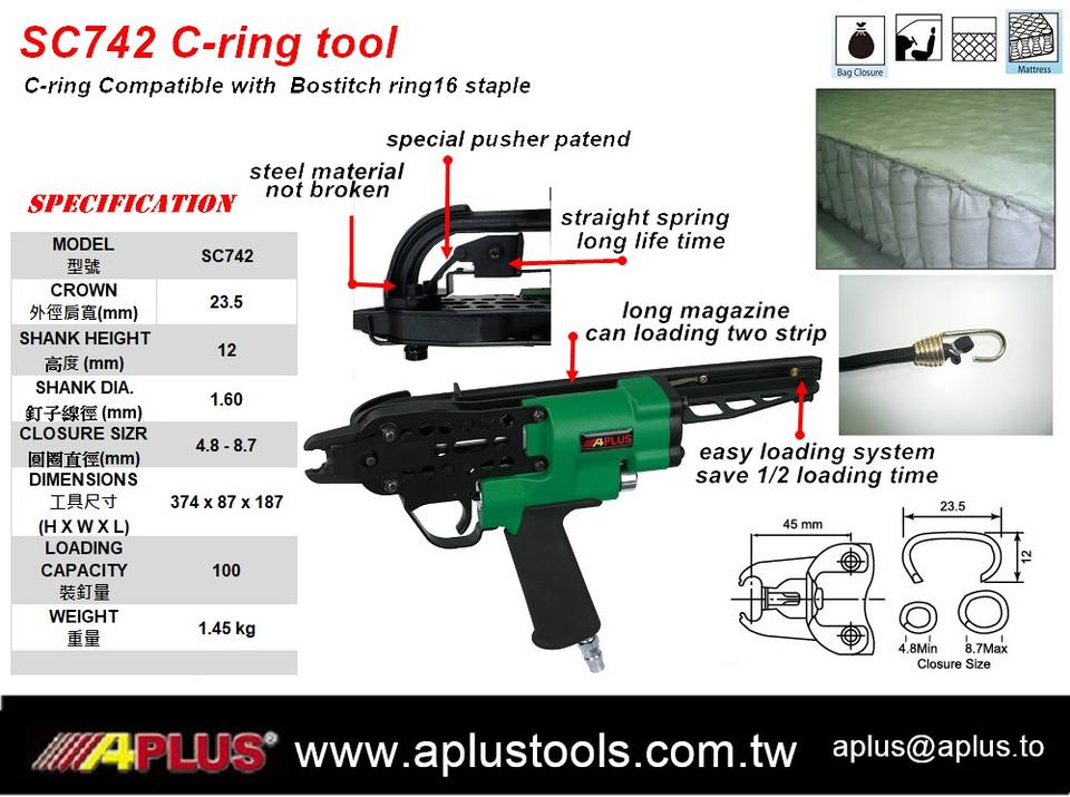 เครื่องมือยิงริงลม APLUS SC742 ขนาดหัว 23.5 มม. ก้าน 1.6 มม. สำหรับกระเป๋าเดินทาง บรรจุภัณฑ์ ได้รับการรับรองมาตรฐาน CE ผลิตจากอลูมิเนียมอัลลอยด์ บรรจุตะปูได้ 100 ตัว