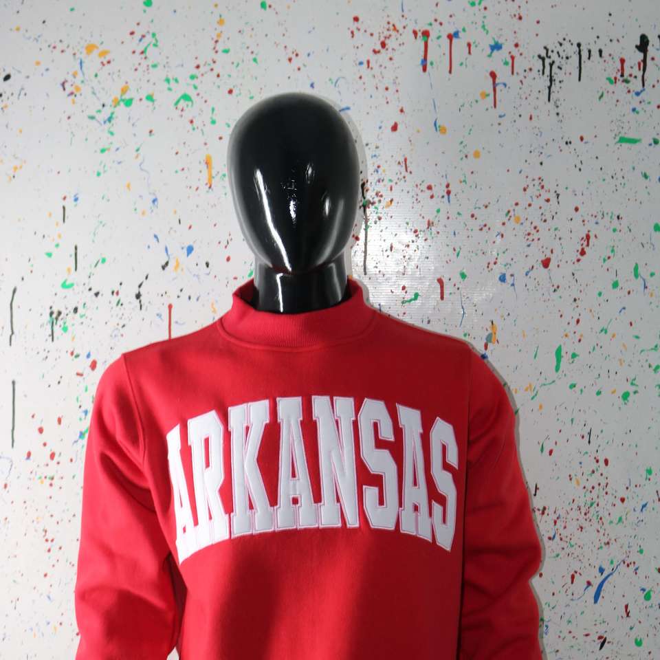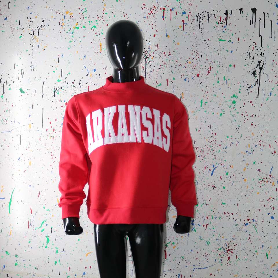 เสื้อสเวตเชิ้ตคอกลมสีแดงอาร์คันซาส ปักลายสีขาว 100% ด้วยด้ายคุณภาพสูง