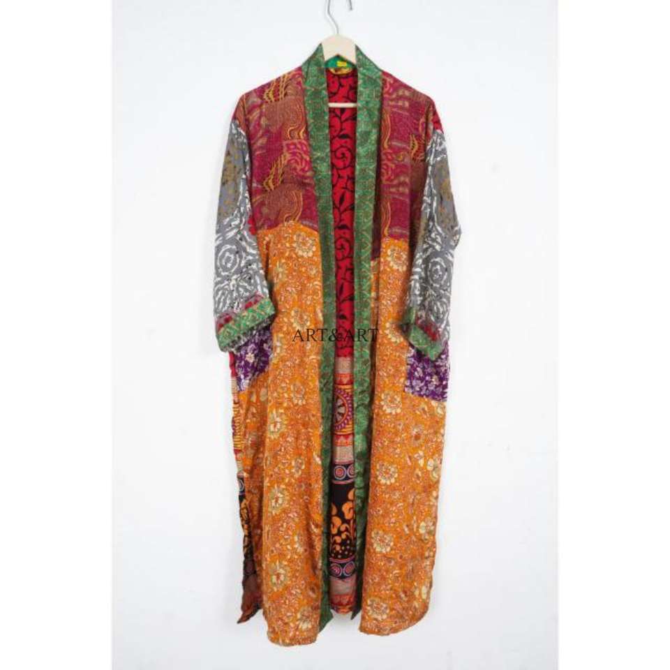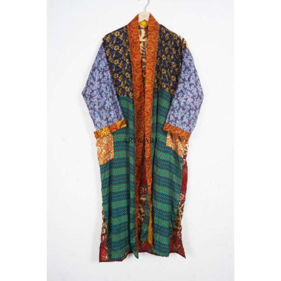 ชุดกิโมโนผ้าไหมอินเดียแท้ คอวี แต่งผ้าแบบแพทช์เวิร์ค เอวสูง สำหรับผู้หญิง ยาวเต็มตัว ปิดด้านหน้าด้วยเชือกผูก สวมใส่สบาย เนื้อผ้านุ่ม