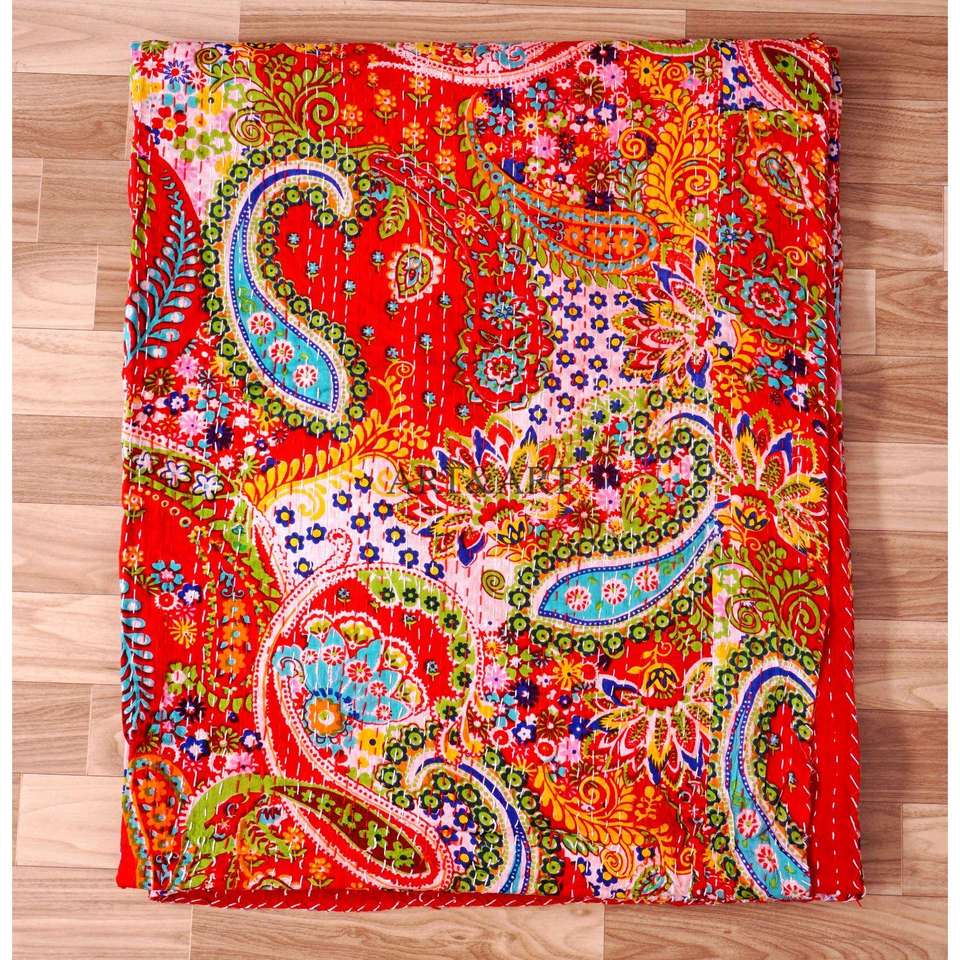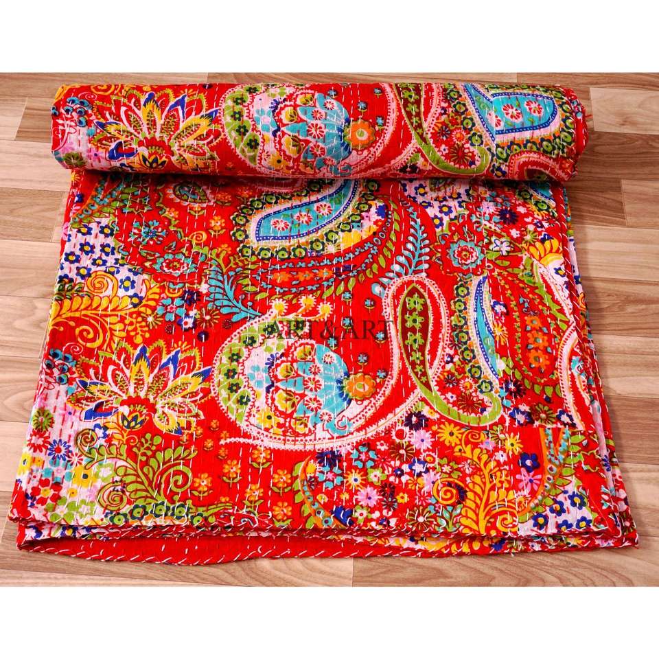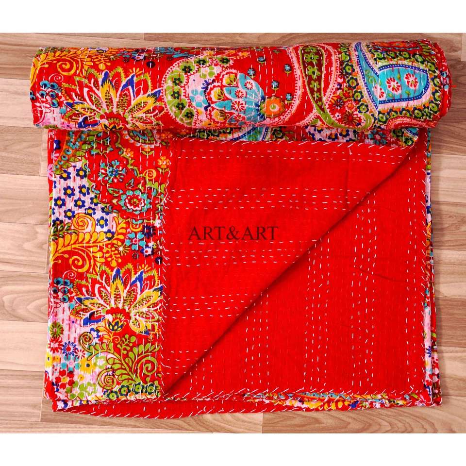 ผ้าห่มอาร์ตแอนด์อาร์ต ลายปักมือแบบกันตะ สำหรับผู้หญิง ผลิตที่เมืองไจปุรี ผ้าฝ้าย 100% พิมพ์ลายดอกไม้ด้วยมือ น้ำหนักผ้า 220 กรัม