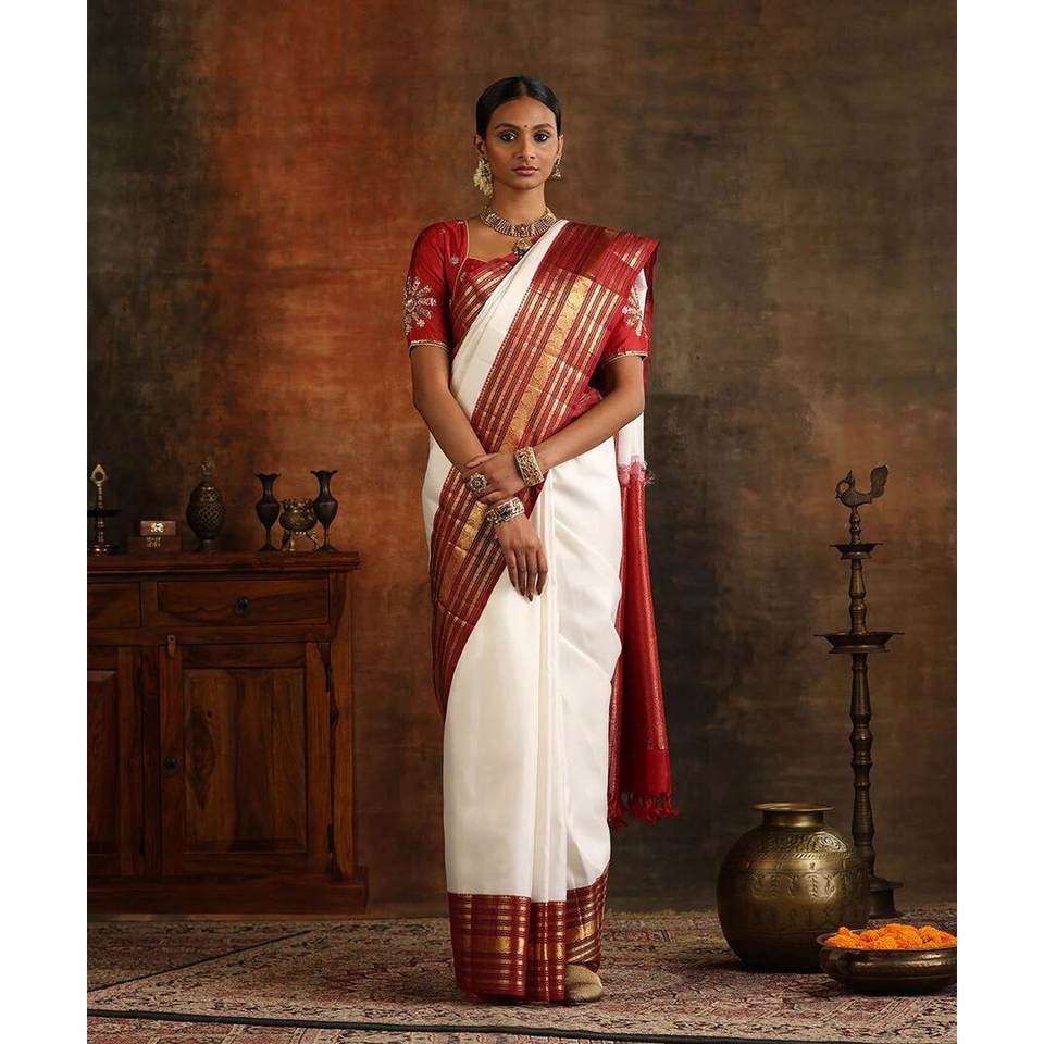 ผ้าไหม Banarasi ที่มีงานตัดเย็บหนักและผ้าสีทองชุดทำงานส่าหรีกับเสื้อสีขาว