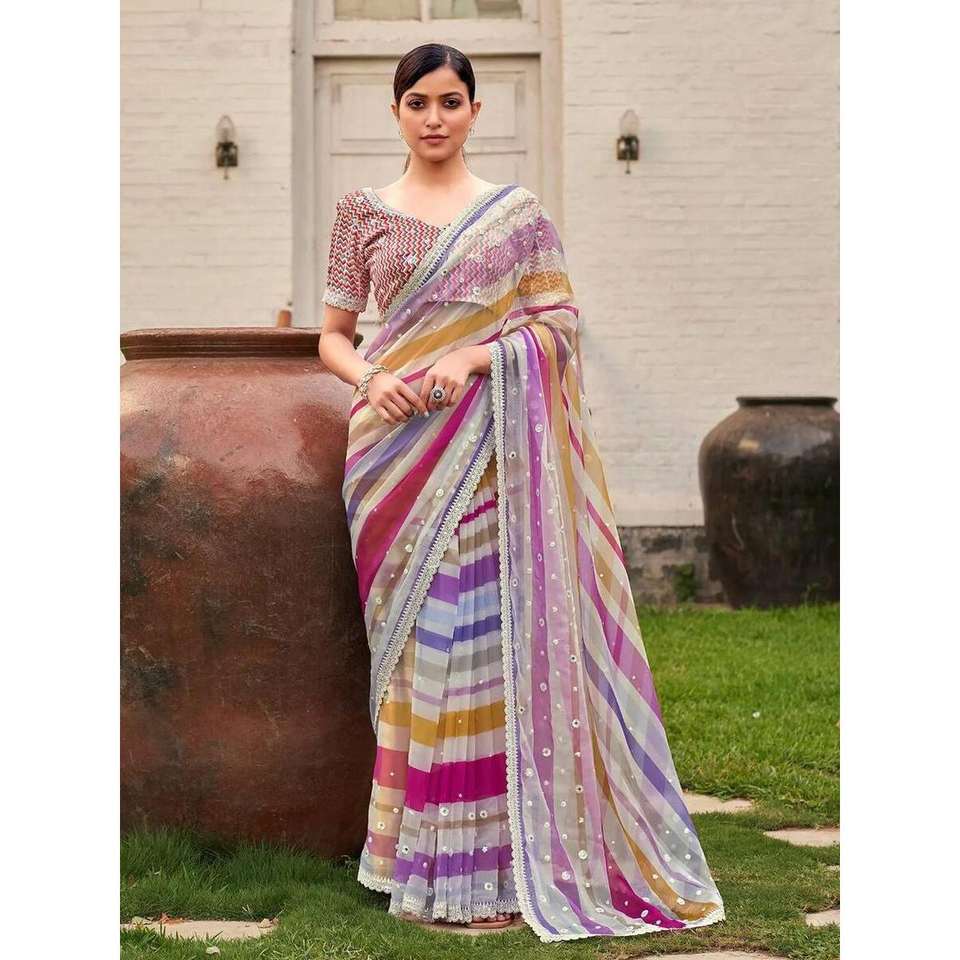 ATTRACTIVE GEORGETTE DIGITAL PRINT and EMBROIDERY SEQUENCE WORK SAREE WITH UNSTITCHED BLOUSE LAVENDER