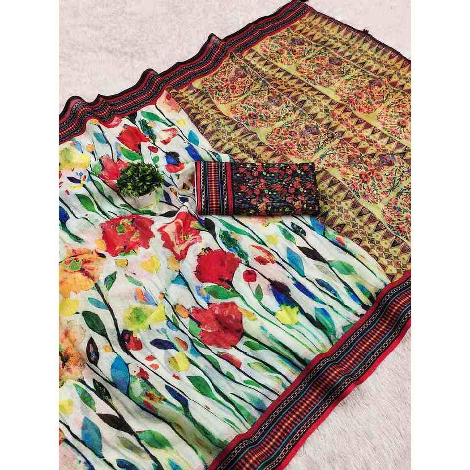 ผ้าลินินพิมพ์ลายดิจิทัล Saree กับเสื้อ unstitched สีน้ำตาล