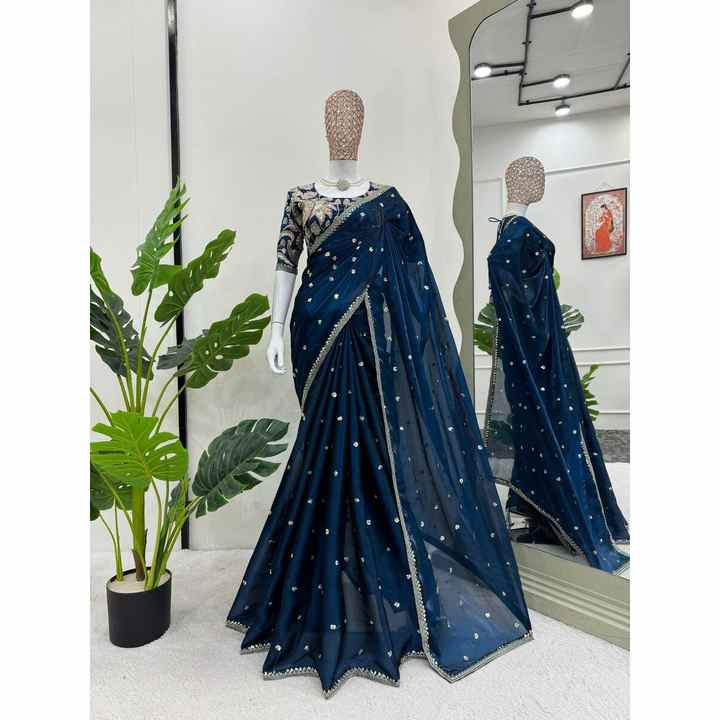 ผ้าไหมที่สวยงามประดับด้วยงานปักด้วยด้ายและเลื่อม พร้อมเสื้อสตรีแบบยังไม่เย็บติดกับผ้า (แบบไม่เย็บติด) สีรามา