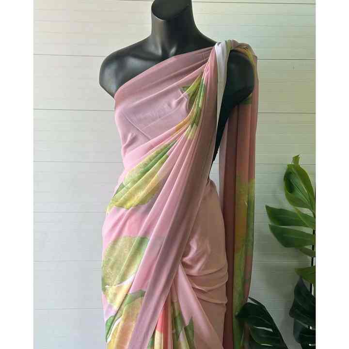 ผ้าส่าหรีทำงานพิมพ์ลายดิจิทัลผ้าจอร์เจียเรียบเนียนสวยงามพร้อมเสื้อเบลาส์ไร้ตะเข็บสีพีช