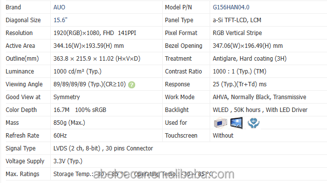 หน้าจอ AUO ขนาด 15.6 นิ้ว TFT LCD IPS ความละเอียด 1920x1080 รุ่น G156HAN04.0 โมดูล LCD