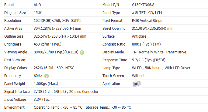โมดูลจอ LCD อุตสาหกรรม AUO ขนาด 15 นิ้ว ความละเอียด 1024*768 หน้าจอ LCD ความสว่าง 1800/800 nits จอแสดงผล TFT รุ่น G150XTN06.A/ G150XTN06.B/ G150XTN06.C