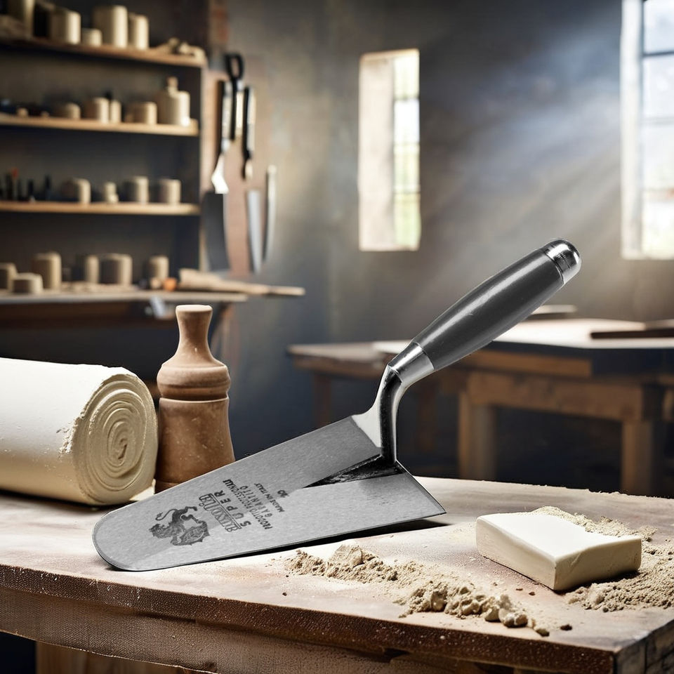 เกรียงฉาบปูนเหล็กกล้าคาร์บอน AUSONIA ลายวงกลม สำหรับงานก่ออิฐและฉาบปูน ขนาด 20 ซม. พร้อมด้ามจับไม้เคลือบเงาตามหลักสรีรศาสตร์
